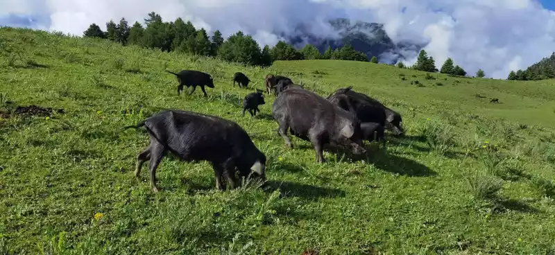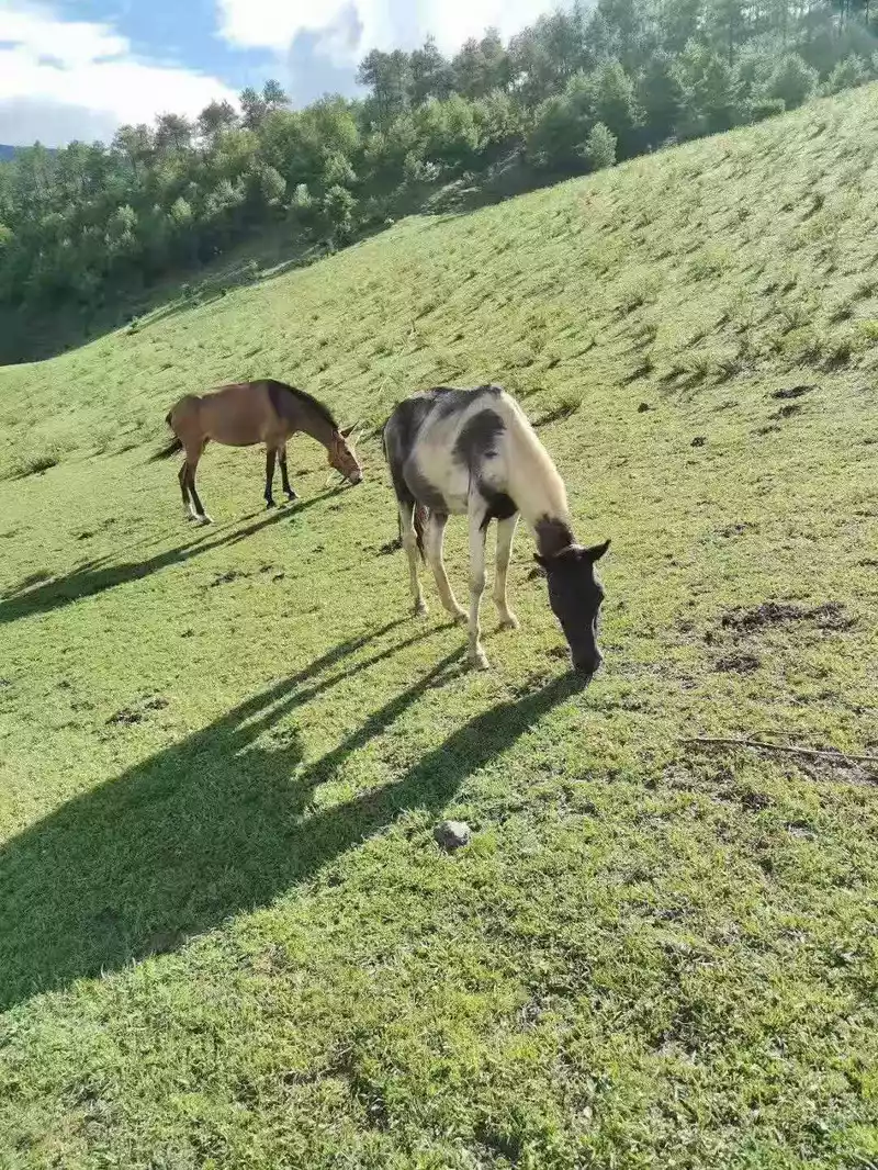 At 8 a.m. on the 12th, we set off on time, and the breakfast of 10 yuan per capita for my sister-in-law was not bad, and the egg was a plateau egg. The groom also humped our utilities on horseback. The donkey entered the mountains and forests to compete for freedom, went up a hillside, and looked around, oh, the grass was like grass, oh the alpine cuckoo, oh, the blue sky and clouds, oh, the cattle and horses were herded, and the fragrant pigs were so cute. The 5-day heavy rock hike showed her fairytale-like world at the beginning, Baishui put up the drone, took out the SLR camera and clicked non-stop, like the ideal into reality, the reality is so dreamy, I have been walking in front of the team, I have always felt dreaming, I have been worried that I am not allowed to enter the mountain, because this line has accidents every year, and last year there was a forest fire in Liangshan that shocked the whole country, and many firefighters died. Fortunately, the locals I met on the road all greeted us and said Tashi Dele with a smile, I think Comrade Bian Chu did not brag about this, and he was very satisfied with his ability to ensure that we entered the mountain smoothly.