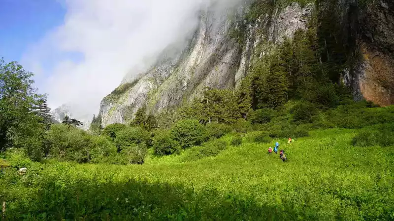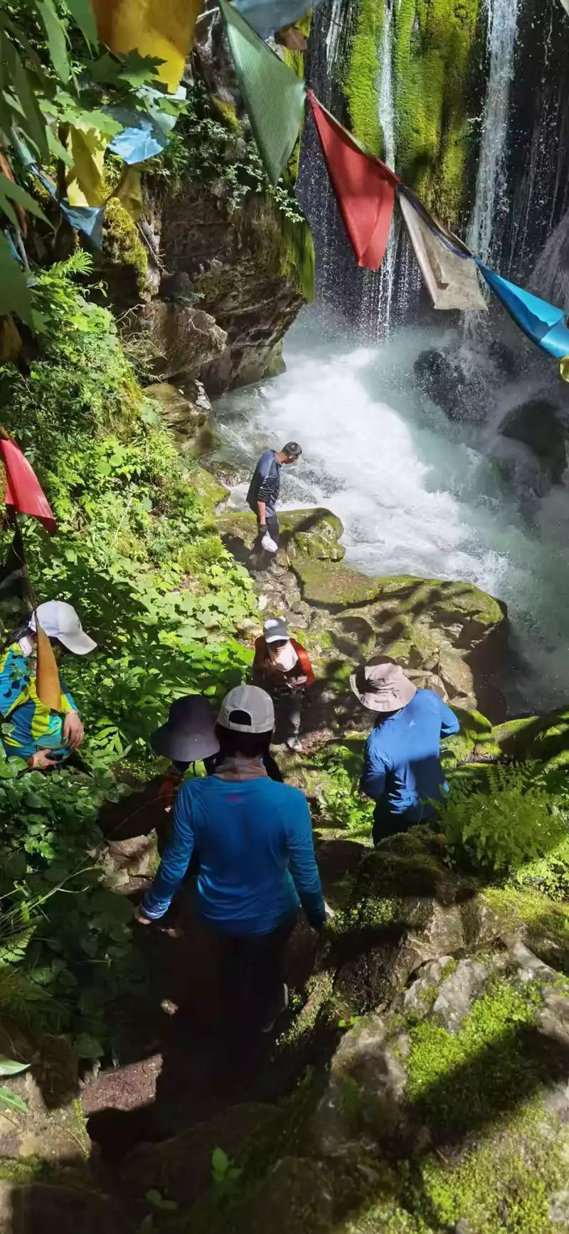 The team stopped and walked, along the Baishui River upstream, the altitude also rose all the way, at noon, unknowingly reached the Bodhisattva Cave at an altitude of 3,000, the Bodhisattva Cave is a group of lotus-shaped waterfalls formed by the Baishui River, the waterfall falls into the cave, very magical, is a sacred place for Tibetans, it is said that it can wash away a body of sin, Brother Guang and Baishui are very excited, Take pictures of your teammates one by one in the hole, and after taking the photos, I think their sins have been washed away, <