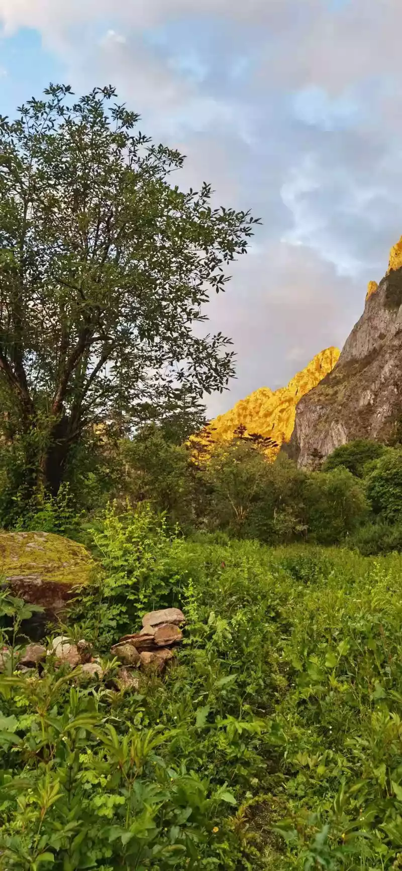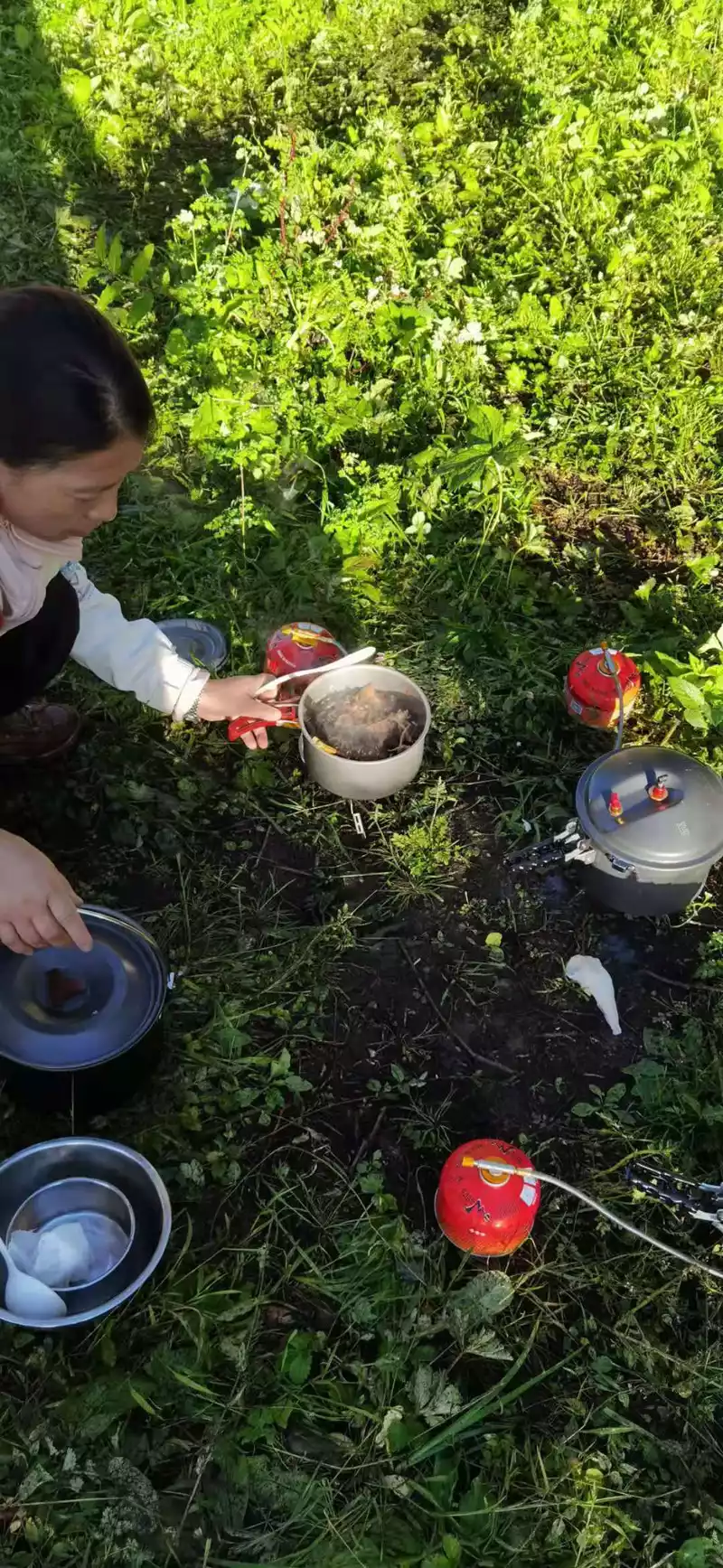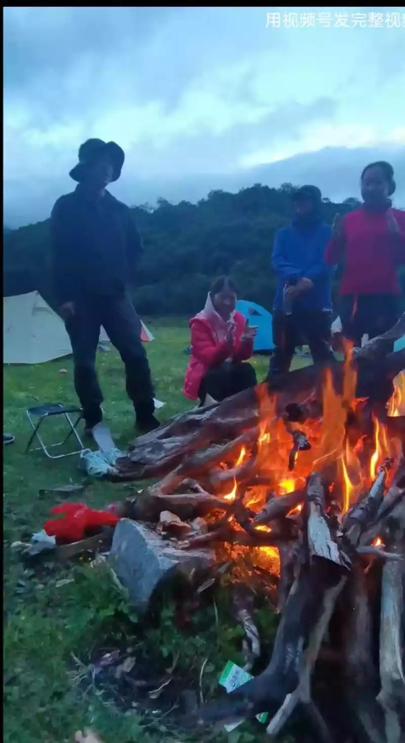 Turning from the side of the sacred mountain is all the way downhill to the Xinguo cattle farm camp, from a distance we saw the camp under the snow-capped mountain with mountains and water, birds singing and flowers fragrant, when we arrived at the camp, we heard the villagers who went up the mountain to collect the camp fee tell us that the rural comrades had safely evacuated to Xialuo Village yesterday, and everyone felt relaxed and relieved, this day, We walked 8.33 kilometers and arrived at the camp at 16 o'clock in the afternoon, everyone leisurely set up a tent, and the locals set up a fire, at which time a group of donkey friends from Ningxia also joined us. People outdoors, easy to deal with, under the encouragement of teammate Ruoyan, the atmosphere became very warm, we sang and danced by the fire to tell stories, and had a pleasant evening, especially the story of "Bell Ringing" told by Brother Guang, which is really a classic story, and our dance is also very beautiful, of course, my singing voice also sings my rock voice. The bonfire was very warm and warm.