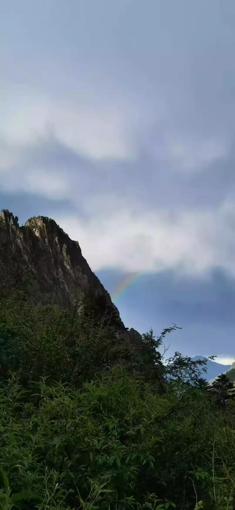 Finally, we arrived at the first camp, Mancuo Camp, that afternoon. During this period, the rural comrades walked a little slowly, the god of the clouds and the little horse accompanied him, and the rural people had a high reaction after arriving at the camp, and the body temperature reached 39 degrees. While admiring, everyone is very concerned about his state, you must know that it will be very uncomfortable in the future. In the evening, it rained moderately, and Brother Guang's dual-purpose tent could be used as a canopy, we squeezed together to cook dinner under the canopy, and the rural people ate the fever and high anti-anti-medicine we brought after dinner and rested. After the meal, the rain stopped and the sky cleared, and a rainbow appeared in the valley, and I sincerely wished the rural comrades to wake up and resurrect with full blood.