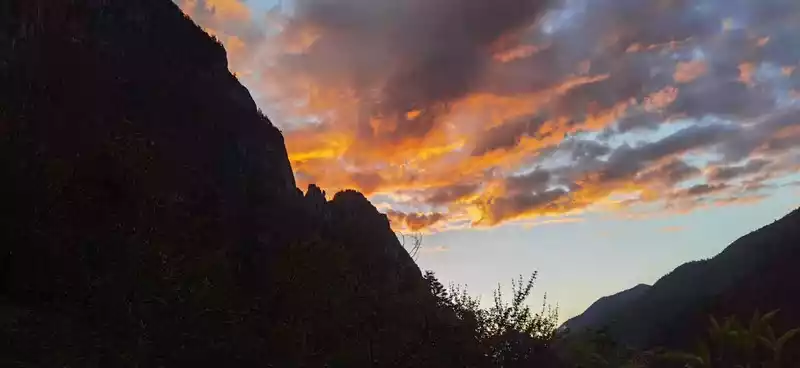 The Shuiluo River rushed down in the canyon, we circled along the riverside, and finally arrived at the first brother's house, his brother is relatively simple, the first home is halfway up the mountain in Xialuo Village, and is currently cooperating with a Guangxi boss to open a farmhouse, the hotel has not yet been fully built, one side of the water and soil to raise the other side, Xialuo Village is better geographically located than Dudu Village, but also brings them opportunities, At the same time, it also allows them to learn to drill camps, and the hotel that has not yet been built is 80 for a bed, and if you don't stay, you will have to charge 50 for setting up a tent, and the following regulations are more domineering than five-star scenic spots. No way, who told us to yearn for the Locke line so devoutly, I think back then, Locke might have spent a lot of money to buy sin. At the beginning, my brother caught a plateau chicken to kill and eat with us, it seems to be 200 a piece, it is a little more expensive, but we are willing to eat it, here, I still want to give a thumbs up to the editor, this person is very principled 80 yuan for a bed fee, this person will definitely make a fortune as a cadre in the future. Silent all night, it rained in the middle of the night. I woke up from my dream to see the sky full of morning glows, and I thought we had chosen the right date, and the mountain god was welcoming us with a bright smile.