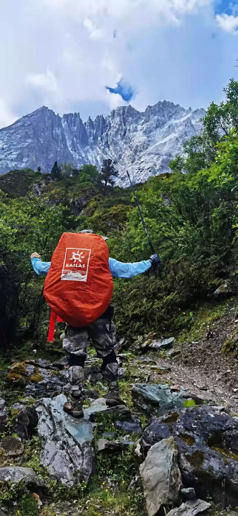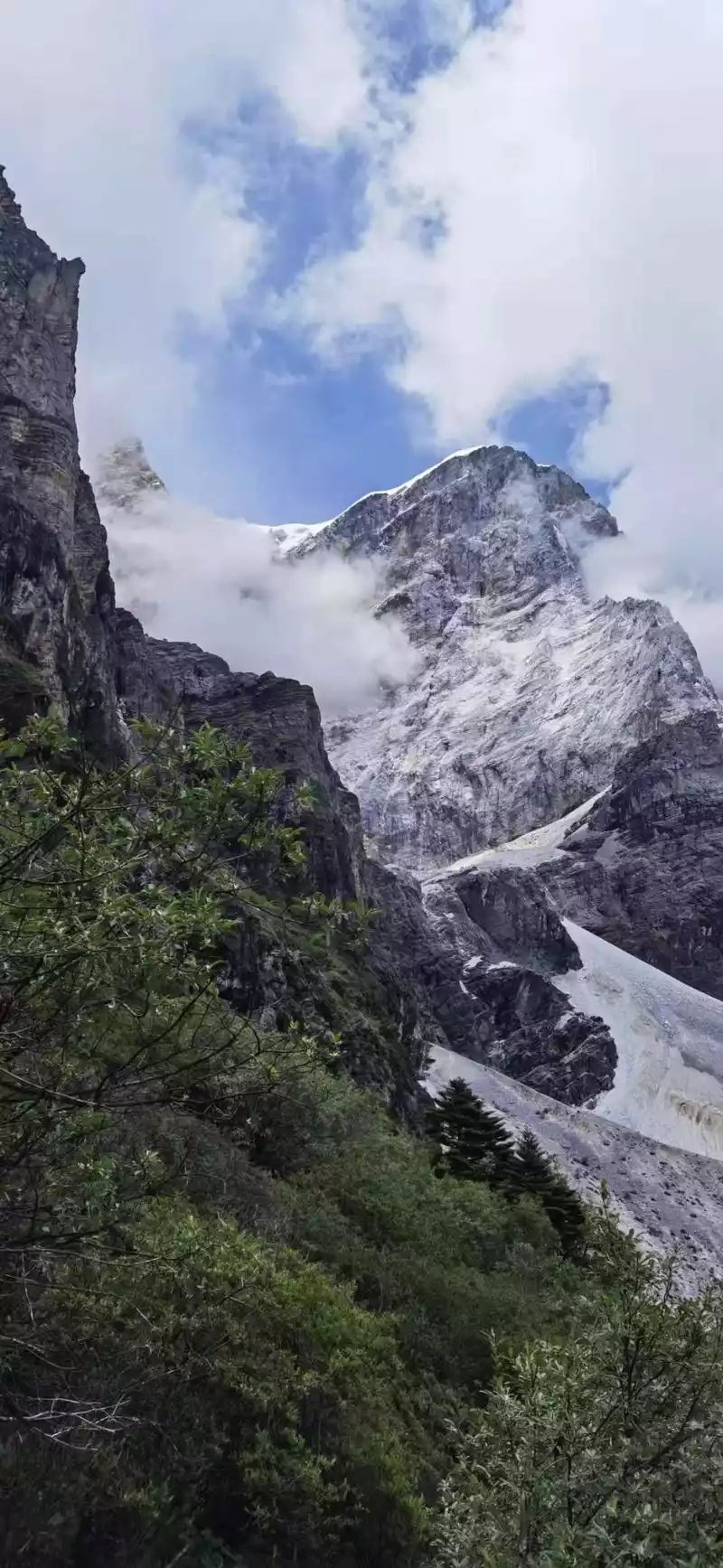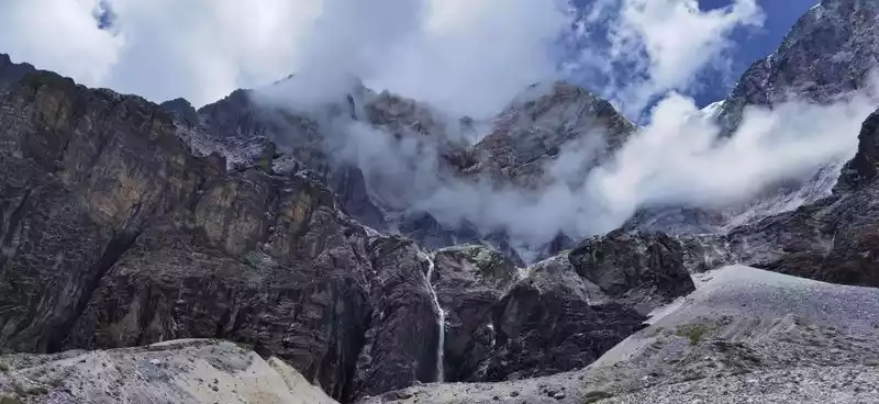 Not far from crossing the pass, we met the second sacred mountain of the Rock Line, Yang Maiyong, I stopped under the sacred mountain for a long time, waiting for him to clear the clouds and mist to reveal his true face. There is an ice-melting waterfall under the sacred mountain, which is very elegant. Brother Guang put down his luggage and climbed under the waterfall to watch, he said that after being drenched in the water of the waterfall, he suddenly felt energetic, and his physical strength instantly recovered a lot.
