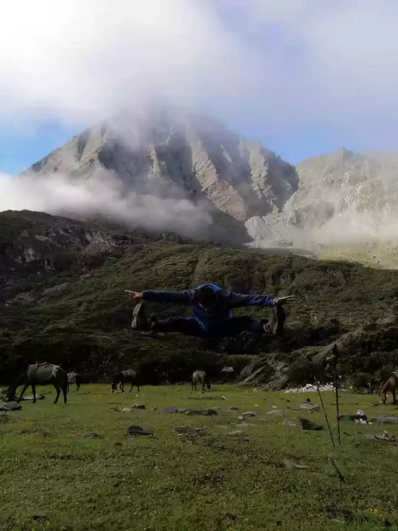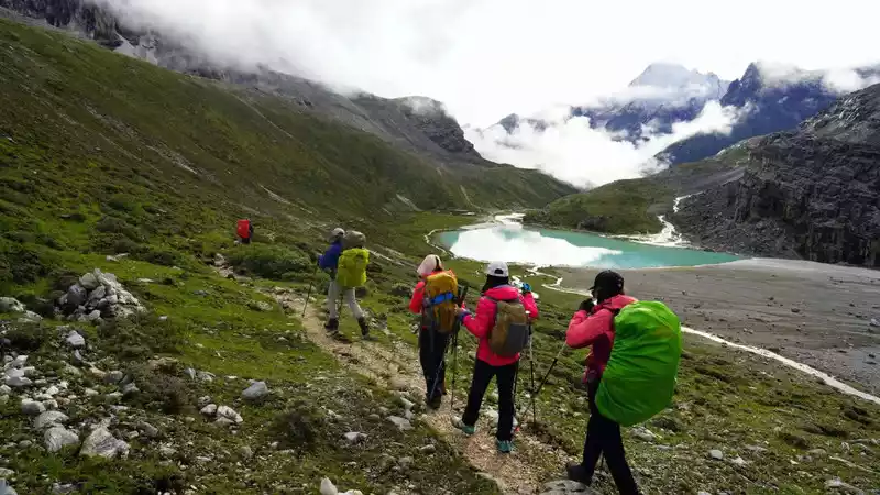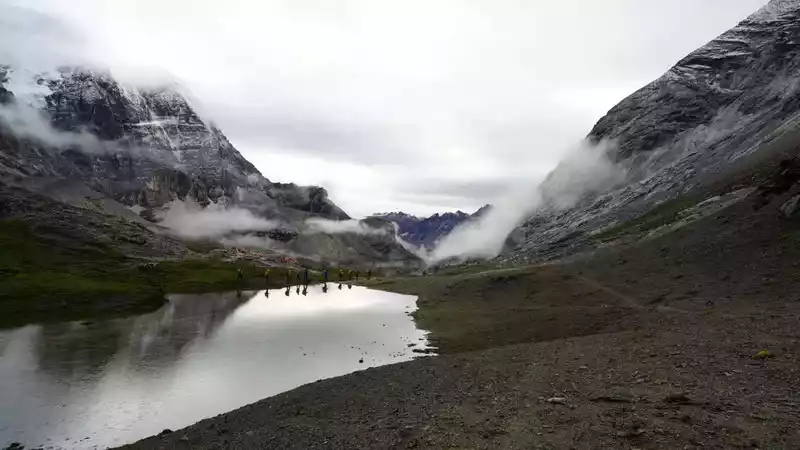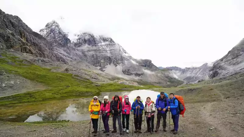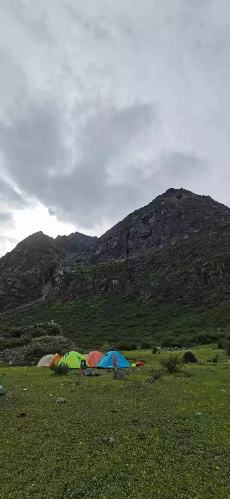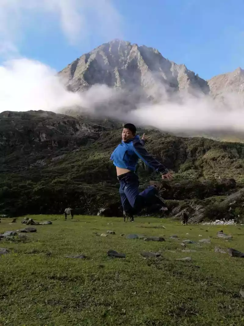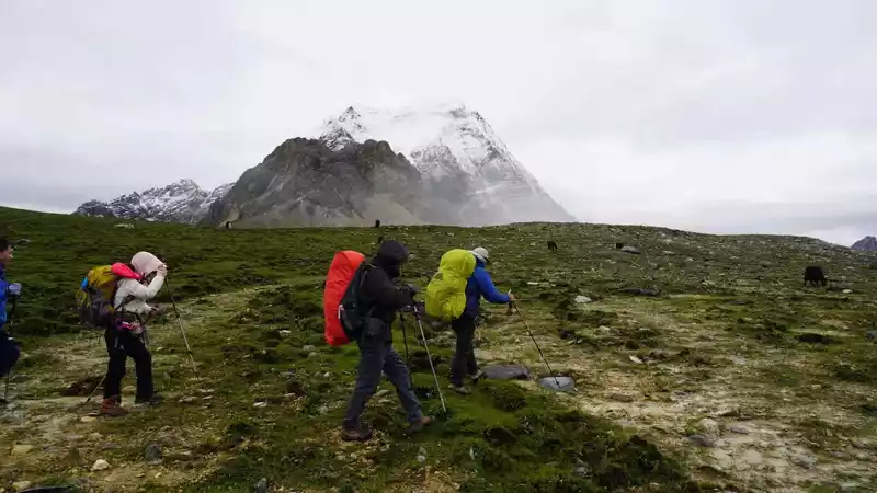 In the afternoon, it was cloudy and rainy, we crossed a pass at an altitude of 4,200 meters, and saw the first sacred mountain of this trip, Xiano Dorji, at this moment the rain stopped and the sun rose, Xiano Dorji showed his majestic figure, gradually appearing in the clouds and mist, overwhelming mountains and seas, with our footsteps, getting closer and closer, the momentum is very majestic, there is really a lineup of 800 Arhat guards. At 17 p.m., we rushed to the camp below the Zabala Pass, which is still 400 meters above sea level from the Zabala Pass, where we will repair overnight and then sprint to the Zabala Pass. When we set up the tent, it rained and hailed, and the tent crackled, and the sacred mountain was telling us to know awe, be sincere, don't be frivolous, be safe, and the arduous journey is still to come.