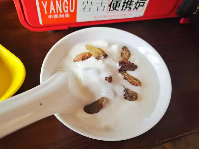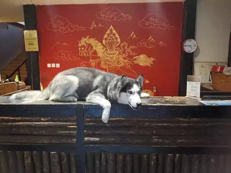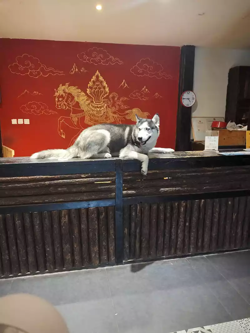 Yak meat hot pot for dinner, as well as yogurt and butter tea. After having enough tea and food, go back to the hotel and take a look at the husky raised by the little chubby brother.This guy eats everything, a mandarin orange is not satisfied, and the slightly sour plum is not let go, the bite is crunchy, and the saliva flows all over the floor. I heard from the hotel owner that it was still pitiful and was brought back from an animal shelter.