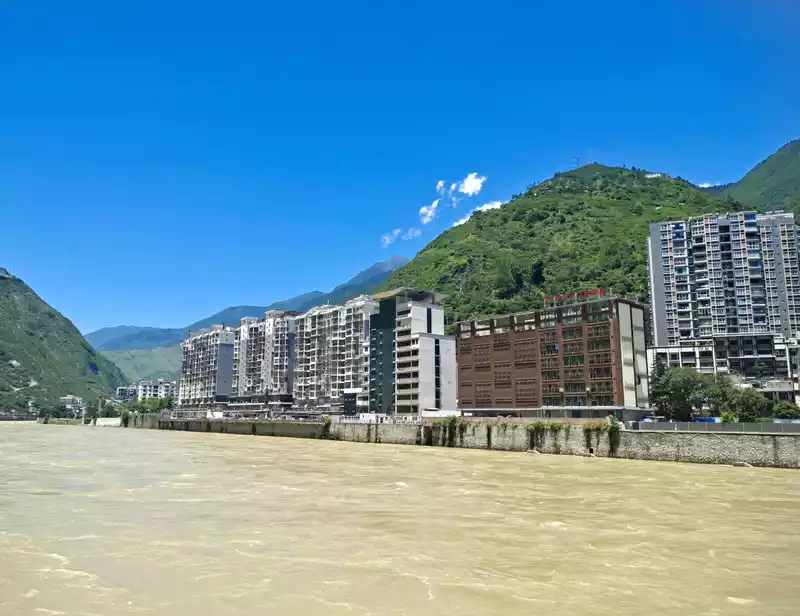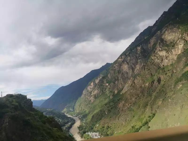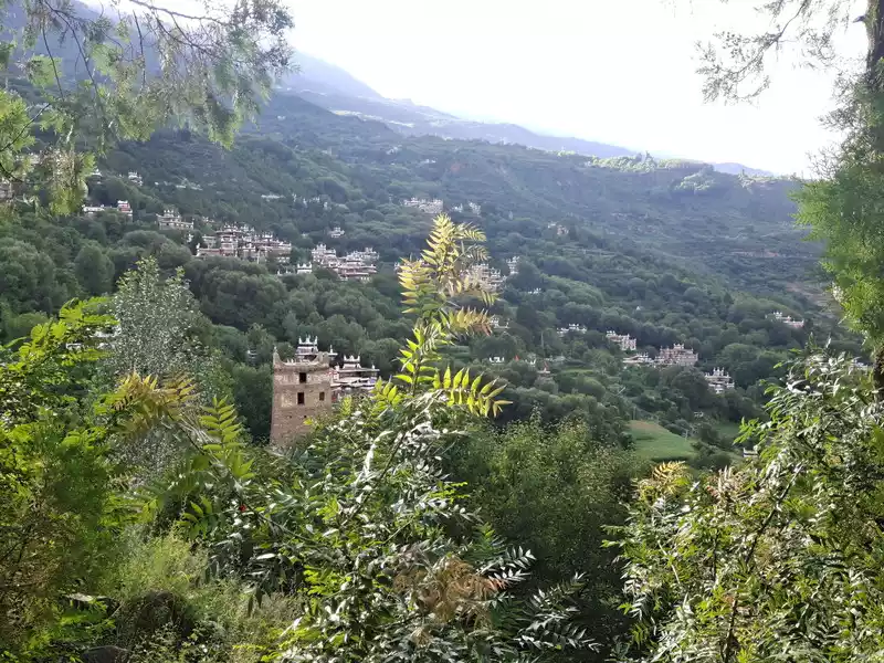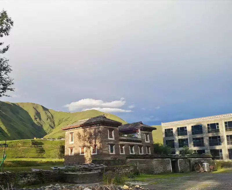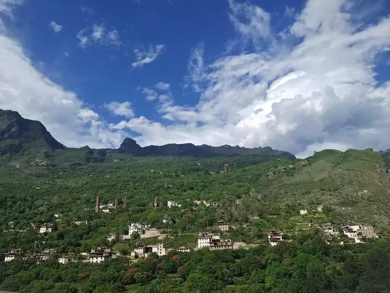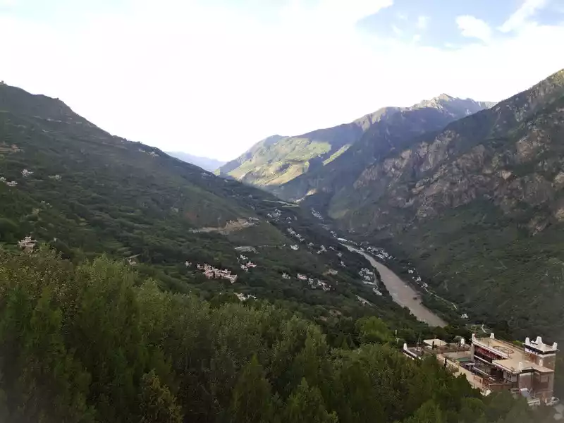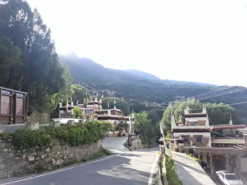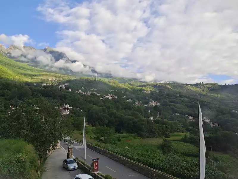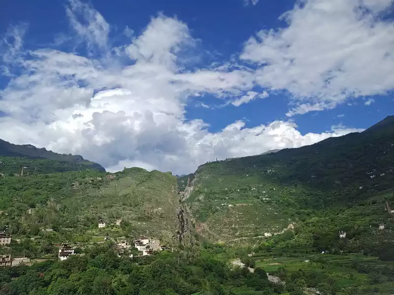 Unique Tibetan houses are dotted halfway up the mountain, and the entire cottage is connected along the undulating mountains, with trees and houses scattered. There are more than 100 Tibetan households living in the village, and peaches, apricots, apples, etc. are planted in front of and behind the houses, and the unripe fruits are hanging all over the branches. The Dajin River River, the upper reaches of the Dadu River, pass through the bottom of the canyon in the middle of the village.Some simple Z-shaped mountain roads can be vaguely seen extending upwards on the mountain, which are the daily passages for Tibetans to go up the mountain.