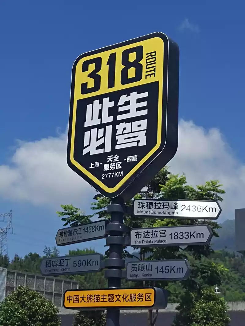 Enter western Sichuan from today. On the highway, the road is good, there are few cars, and the weather is good. Passing through the Tianquan service area, many people check in here. Seeing the street sign "Must drive 318 in this life", the Sichuan-Tibet Line is close at hand.