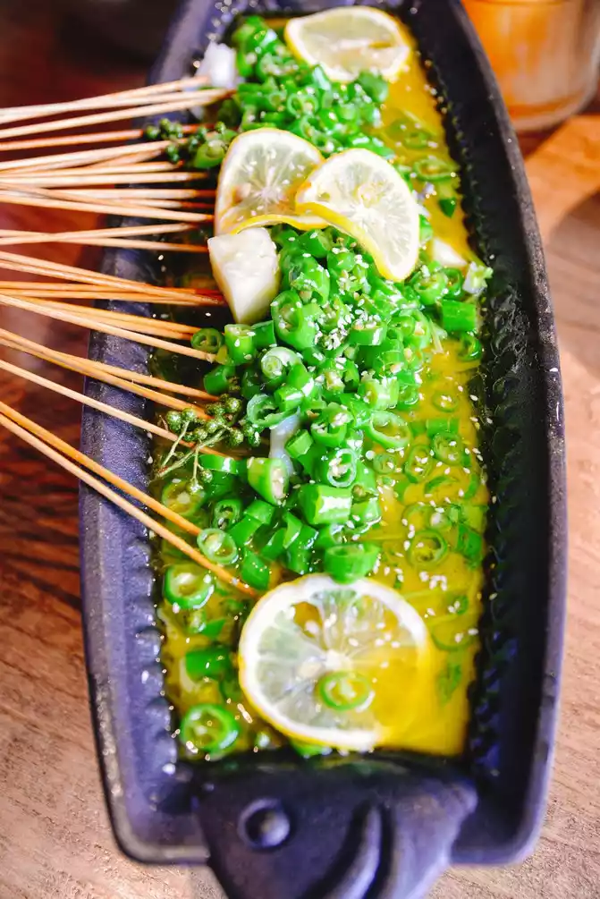 Special grilled fish fillet with green peppers: First boil the fish with sauerkraut fish soup, and then make the fish into skewers, which is very convenient for diners. The sauerkraut fish soup is very appetizing, the fish is tender, spicy and flavorful. It's just that when I ate this dish this year, I felt that there were more peppers than last year~!