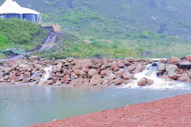 Lianbao Yeze Stone Mountain Scenic Area has a straight and wide road, you can drive directly into the scenic spot, this is simply the welfare of friends who travel by car, with a "here", can't wait to get out of the car, the moment I got off the car I was shocked by the beautiful scenery here, at this moment I just want to pick up the camera in my hand is click and click, suddenly the sky began to snow, so that the scenic spot at this time was shrouded in a mystery waiting for me to unveil her, in the quiet lake sparkling, the water was as transparent as a mirror, Cold and clear, and there is a café currently under construction on the opposite side of the lake, I believe that friends who go to play on National Day should be able to use it, imagining drinking coffee while looking at the beautiful scenery, I really want to say "Ba Shide board".