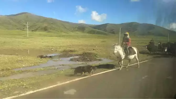 Today's weather is really good, Yangguan is bright, the main attractions are two scenic spots, one is the prairie, and the other is the Gemo Temple, after breakfast, the first to go to the Manzetang Wetland Prairie, along the grassland scenery belt all the way, along the way you will meet some cattle herders driving yaks on the road, and the car will also be forced by these yaks to stop and give way, this spectacle is still very amazing to me.