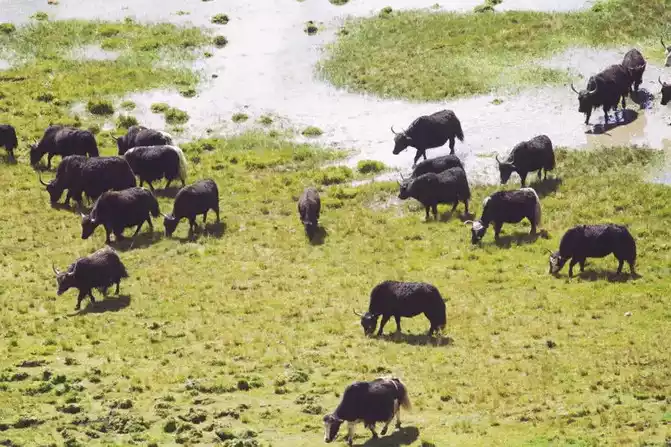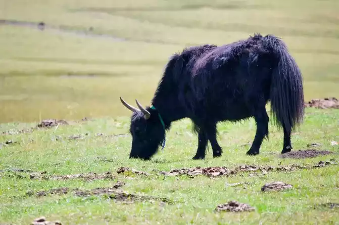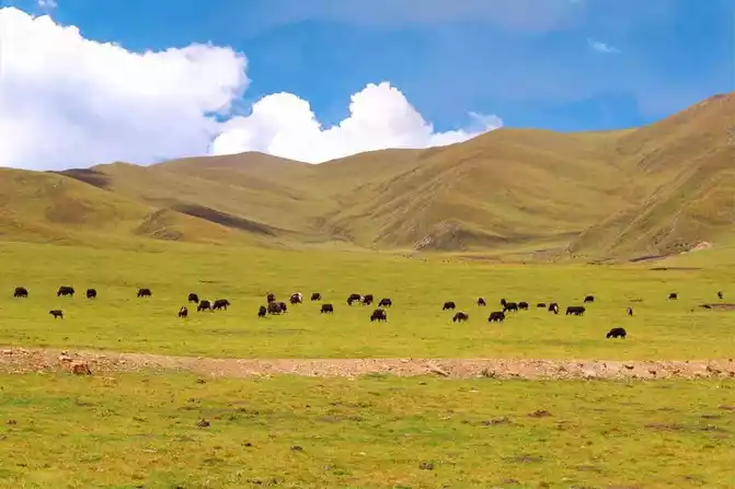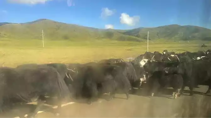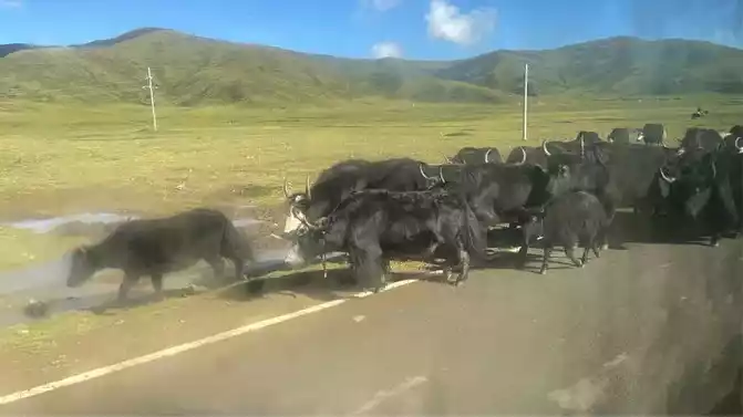The yaks are lazily eating grass and basking in the sun, if they want to get closer, they basically keep a distance of more than 10 meters, which can also ensure safety, if the yak will not hurt people, they want to get closer, You can't get close, and the yak is afraid of tourists, and it will run away if you get close.