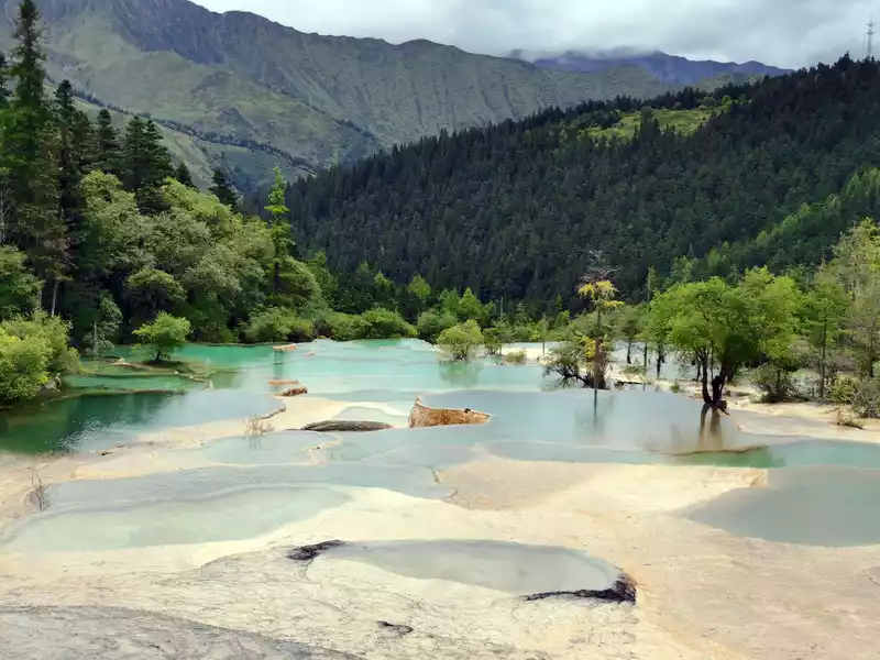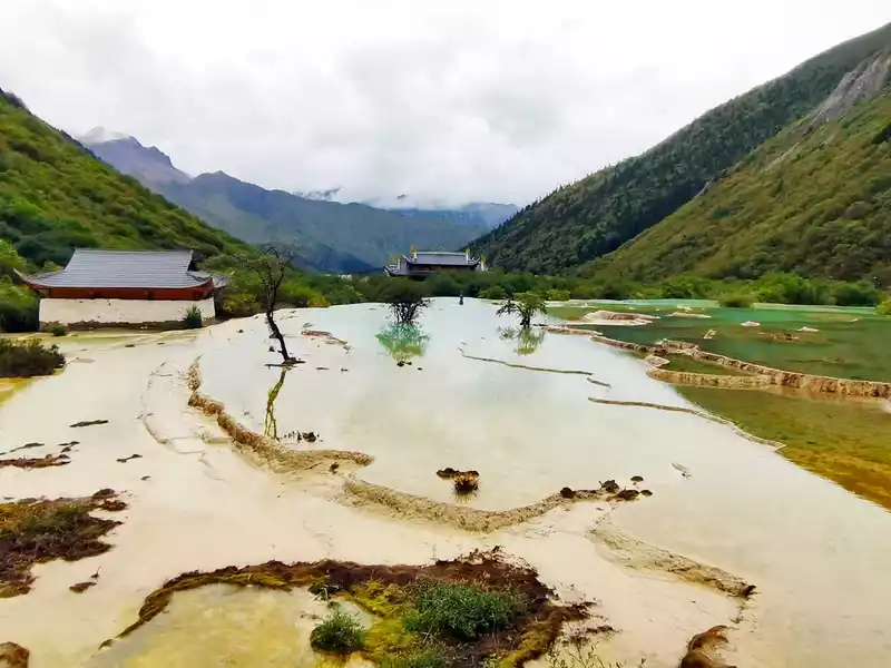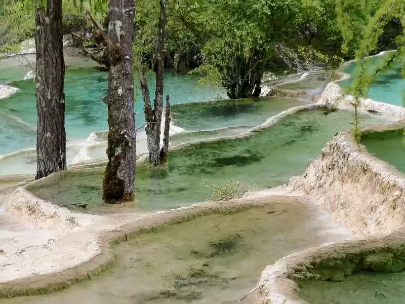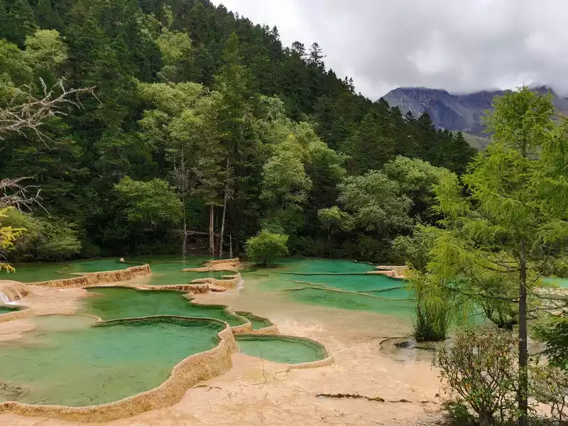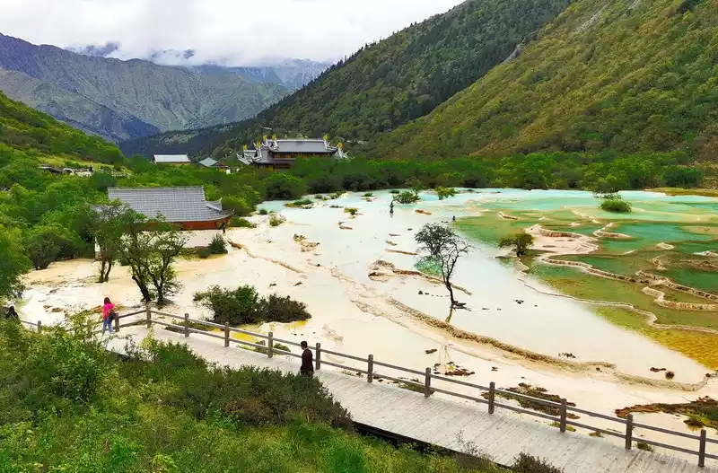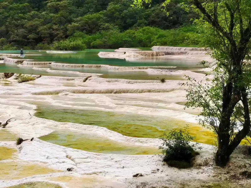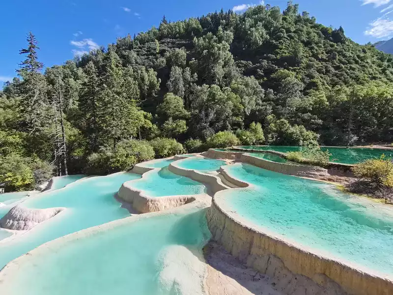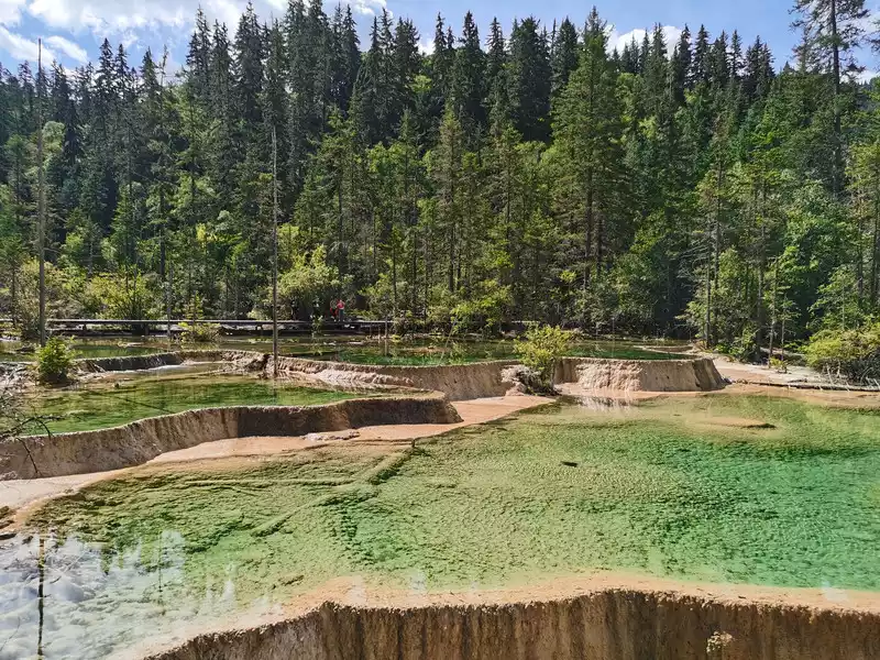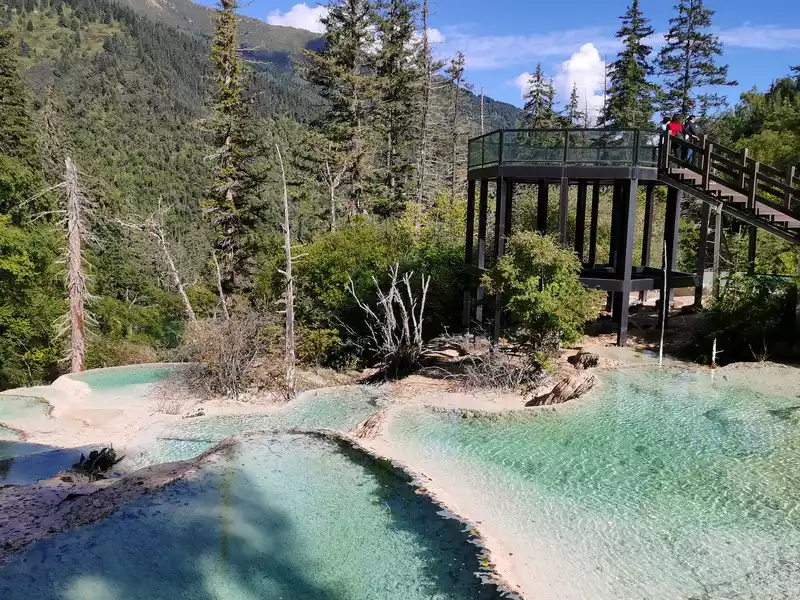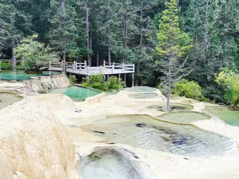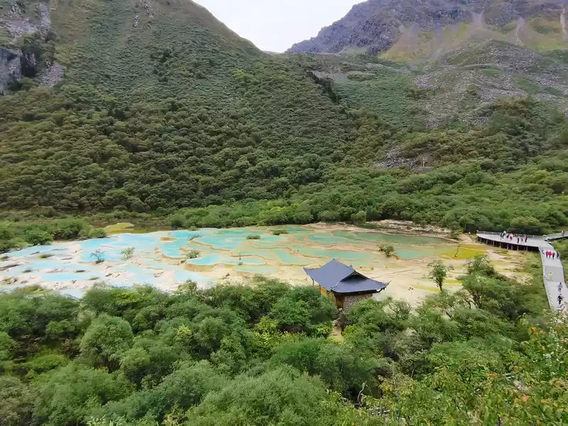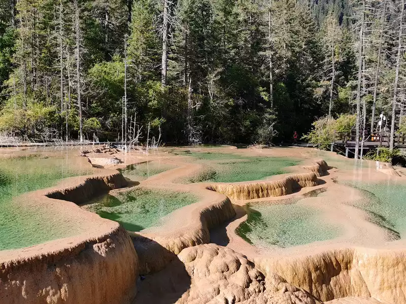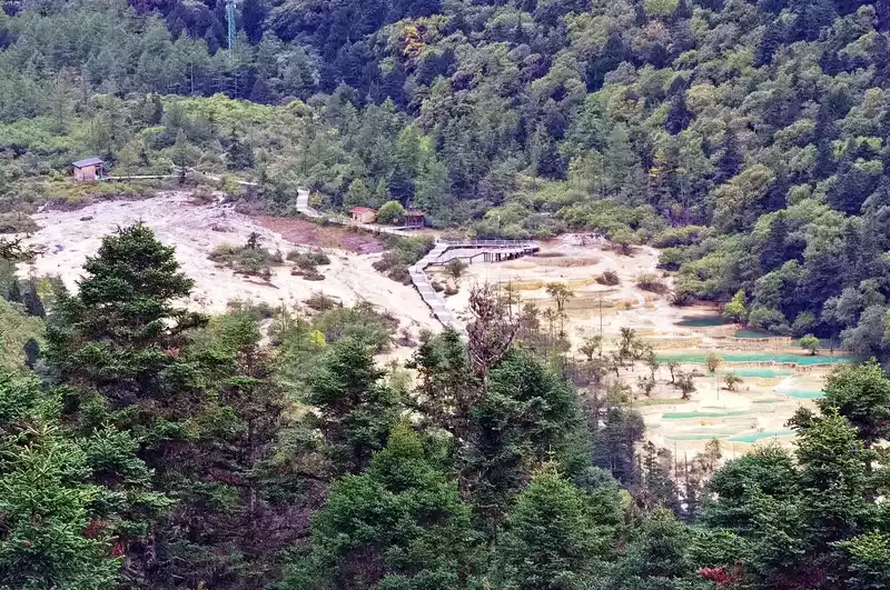 After descending past the "Huanglong Middle Temple" and "Jiexian Bridge", you will come to the "Competition Pool" of the second largest color pool group in Huanglong.