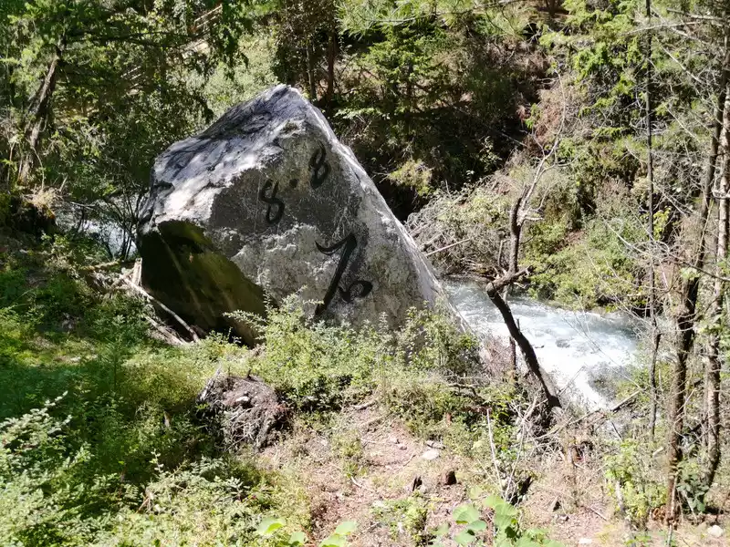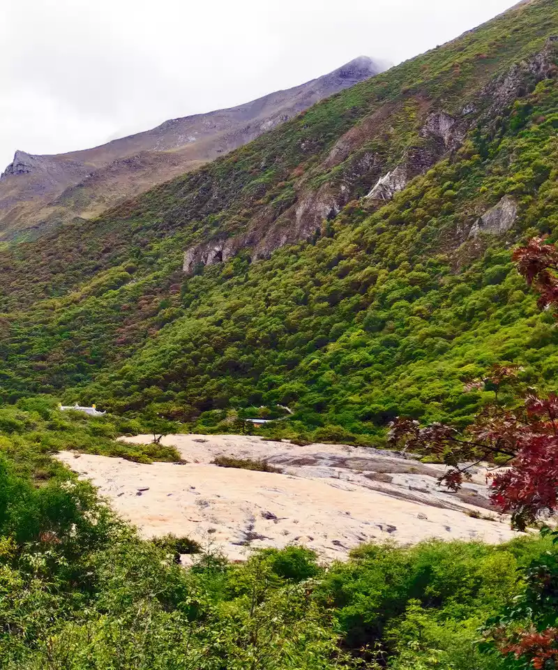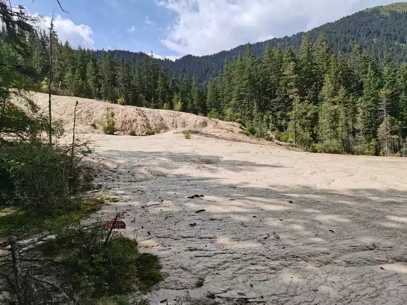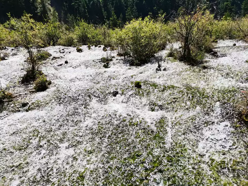 On August 8, 2017, during the Jiuzhaigou magnitude 7 earthquake, a boulder weighing 522 tons fell from an altitude of 2,564 meters above sea level into the river valley, with a vertical drop of 272 meters. The roll down destroyed all the vegetation along the way, forming a huge trench.