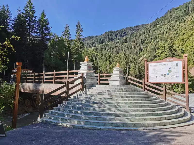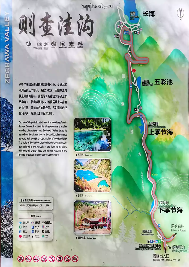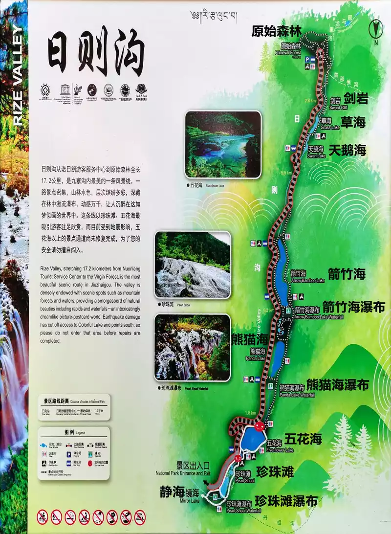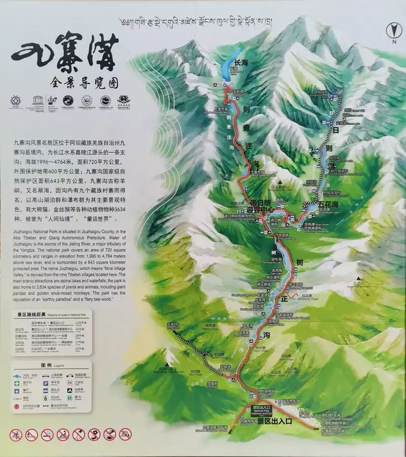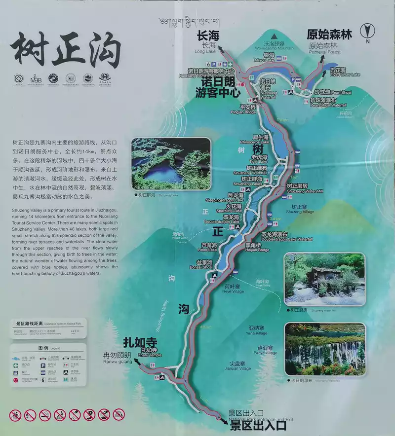 The three ditches of Jiuzhaigou are Y-shaped, and the above is facing south rather than north, which was often wrong in the past.The mouth of the ditch is 14 kilometers into Shuzhenggou, and after arriving at the Nuorilang Visitor Center, it is divided into left and right forks, the left fork is "Zecha Wagou", the farthest is 18 kilometers to Changhai, the right fork is "Rizegou", and the farthest is 17 kilometers to the "primeval forest". At present, "Rizegou" is only open to the "Five Flowers Sea", because the Jiuzhaigou magnitude 7 earthquake on August 8, 2017 caused damage to the scenic spot, and the "primeval forest" line was seriously damaged and has not yet fully recovered.