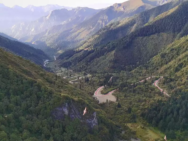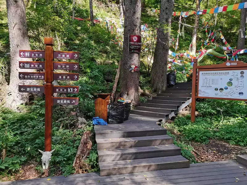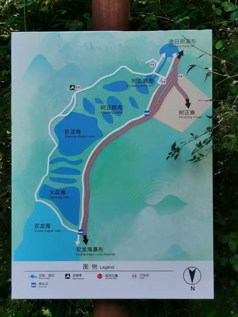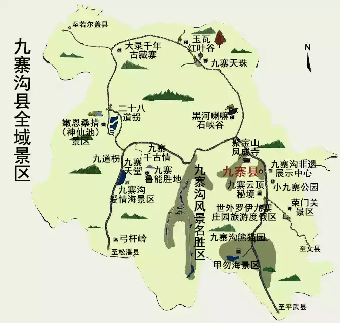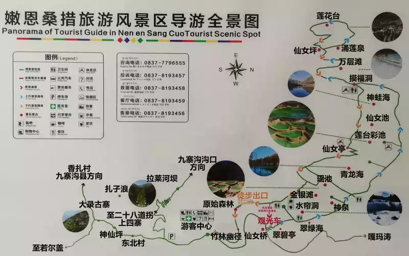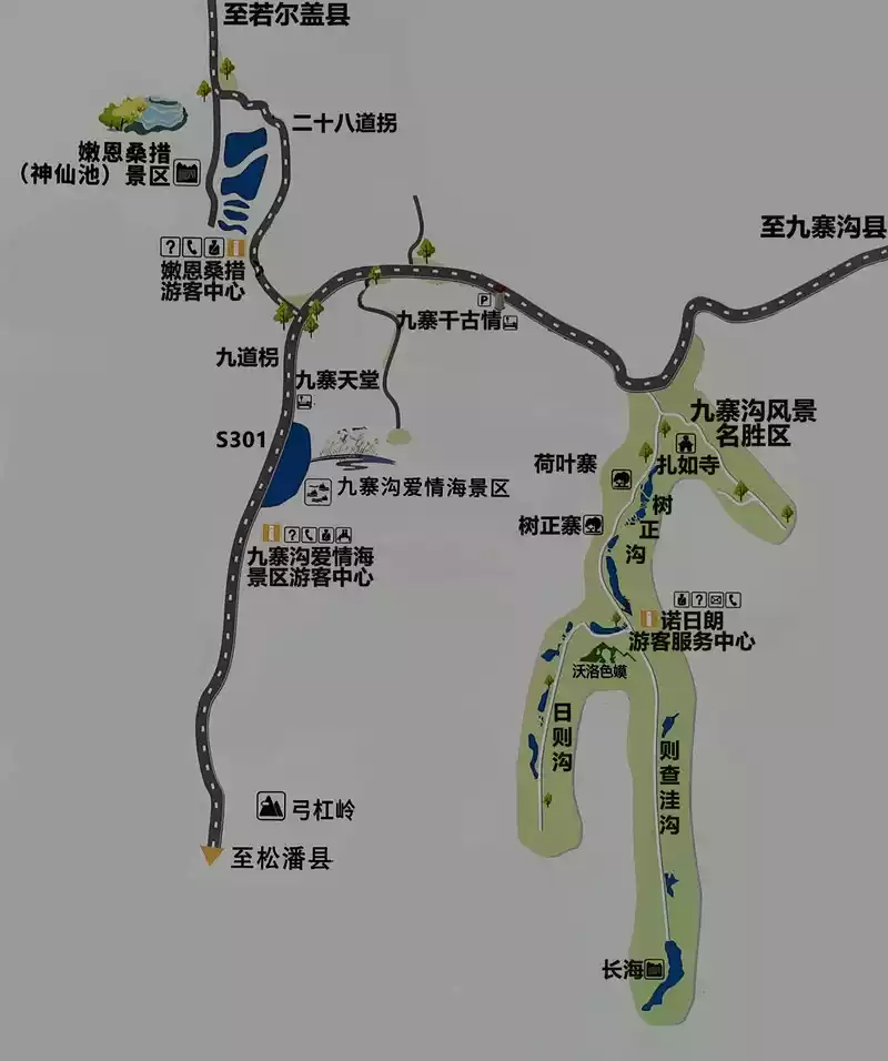 The three ditches of Jiuzhaigou are Y-shaped, and the above is facing south rather than north, which was often wrong in the past.The mouth of the ditch is 14 kilometers into Shuzhenggou, and after arriving at the Nuorilang Visitor Center, it is divided into left and right forks, the left fork is "Zecha Wagou", the farthest is 18 kilometers to Changhai, the right fork is "Rizegou", and the farthest is 17 kilometers to the "primeval forest". At present, "Rizegou" is only open to the "Five Flowers Sea", because the Jiuzhaigou magnitude 7 earthquake on August 8, 2017 caused damage to the scenic spot, and the "primeval forest" line was seriously damaged and has not yet fully recovered.