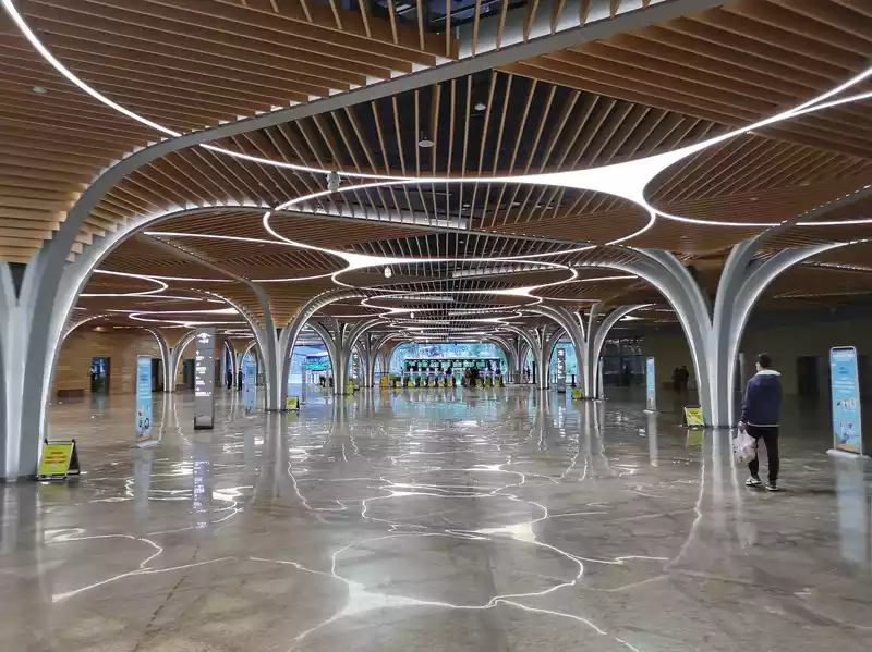 To go to the ropeway station of Huanglong Scenic Area, you can get on the bus from the visitor center to the ropeway station after applying for a ticket, and see that there are almost no people queuing up in the corridor and there are very few tourists.