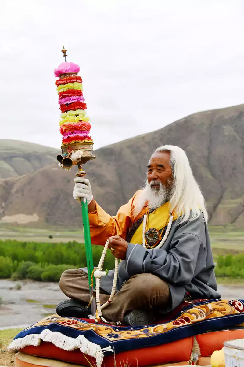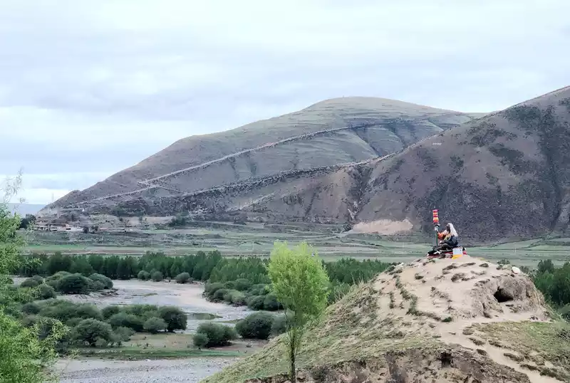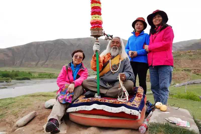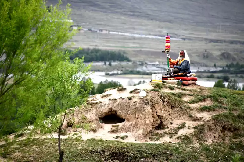 Whenthe car arrived at the Yalong River near Laima Village, Xiaowei stopped the car. I saw an old Tibetan man with a white beard sitting on a small mountain bag, shaking a large prayer tube in his hand. Xiaowei said that he is an Internet celebrity on National Highway 317, 365 days a year, almost every day here. It's rare to meet today.