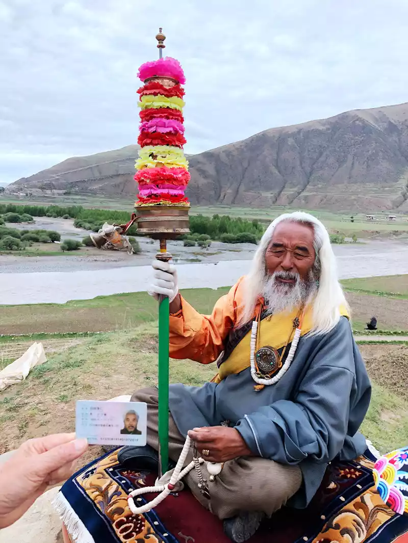 The old man's surname is Wang, 63 years old this year, lives in a nearby village, and has been preaching here for 23 years, except for heavy rain and snow, he comes here almost every day to pray, so that his chanting sound floats across the Yalong River and farther away to the snow-capped mountains with the prayer wheel. After 23 years of sun and rain, the old man had a dark face, a tough body, and a hearty speech, and he took out his ID card to show us. It is really valuable to be able to do one thing in a lifetime and let everyone remember you.