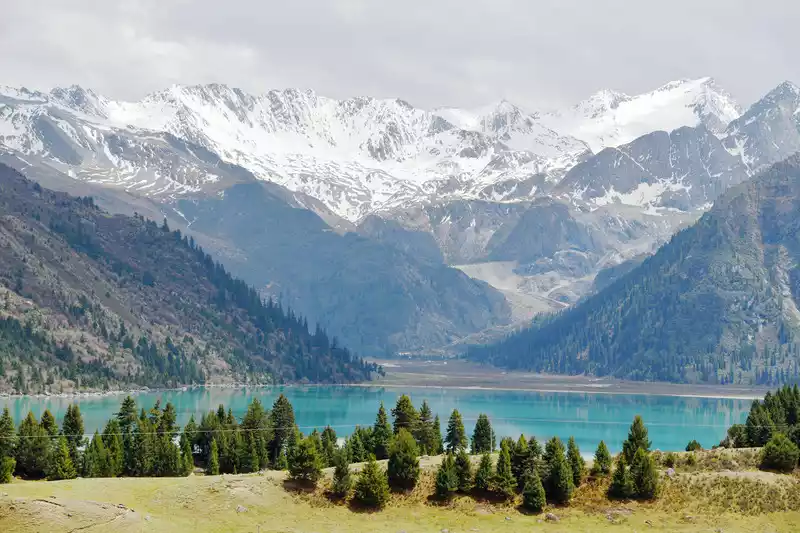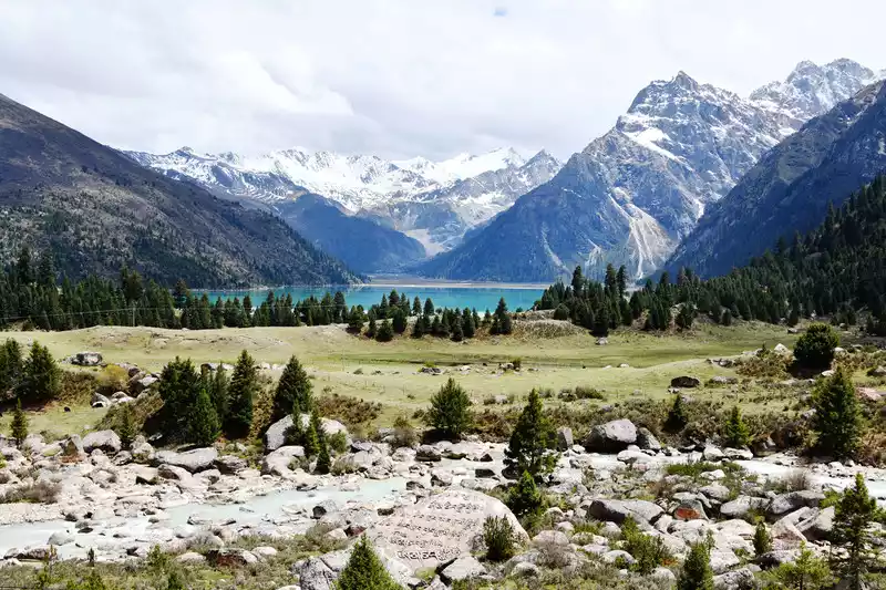Xinluhai did not go in because of the closure of maintenance, so he took a few pictures from a distance on the side of the road. This is the only lake we have encountered along the way, and from a distance, the lake under the snow-capped mountains is blue, surrounded by green pines and cypresses, very beautiful, a bit of the taste of Xinjiang Tianshan.