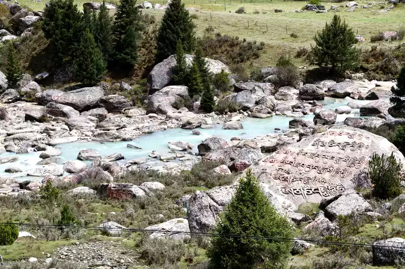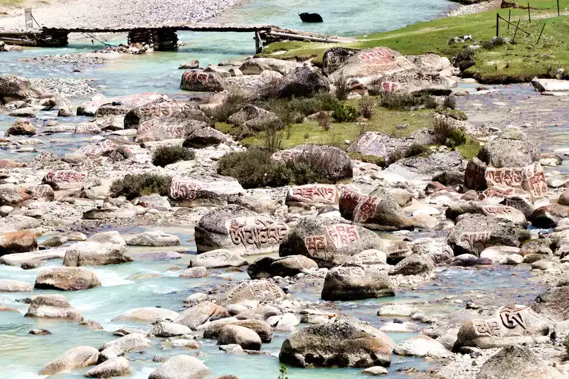 the river flowing outside the lake, large and small mani stones have been washed away by the river for many years, and the colorful patterns have slowly faded. But the prayers in the hearts of Tibetans still flowed slowly into the distance with the current.