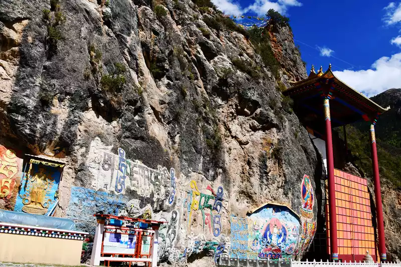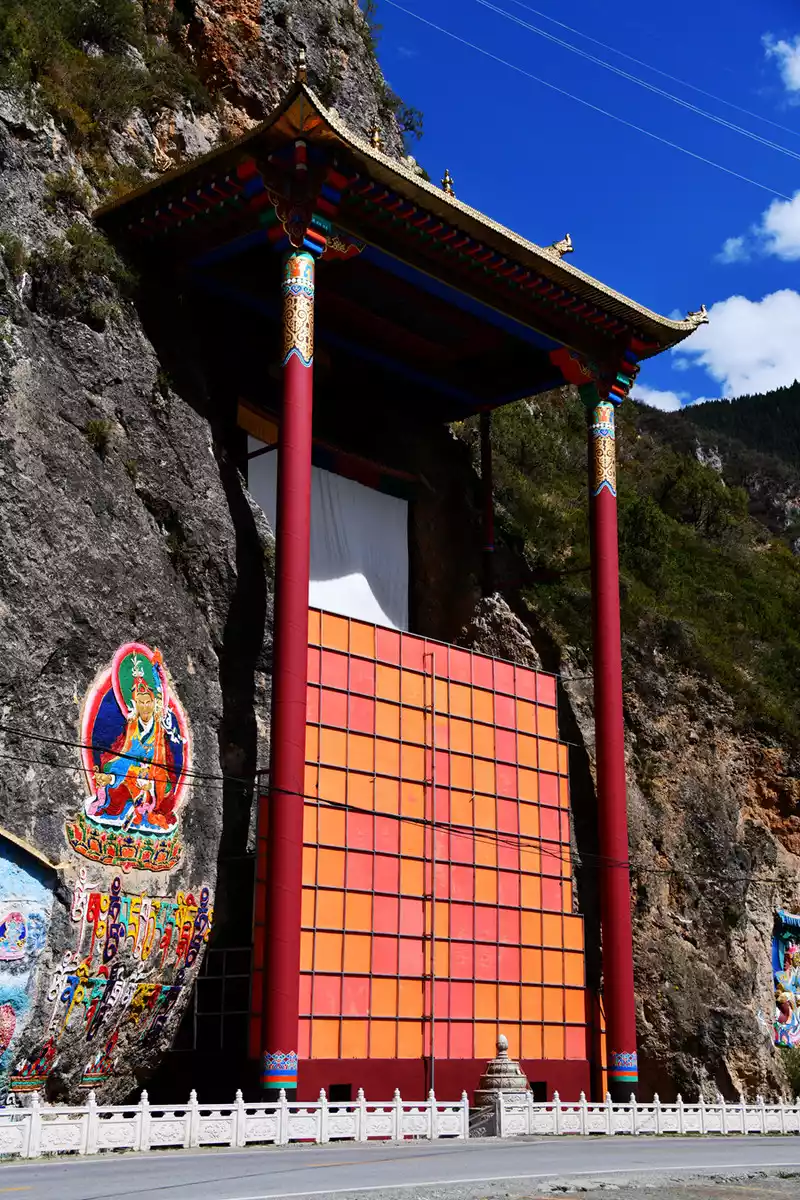 Continuing on, a sign from a tourist attraction tells us that we should enter Dege in Ganzi. This may be a niche scenic spot, because the car guide can't tell what place it is. The signs signed: Dama Cave Observation Deck, Bona Great Pagoda, and Shakyamuni Statue. This is a canyon, a very peculiar Buddha building stands high on the side of the mountain on one side, and two long crimson pillars extend to the top of the cliff, supporting the golden roof. The rock wall is embedded with several beautifully carved and painted Buddha statues.