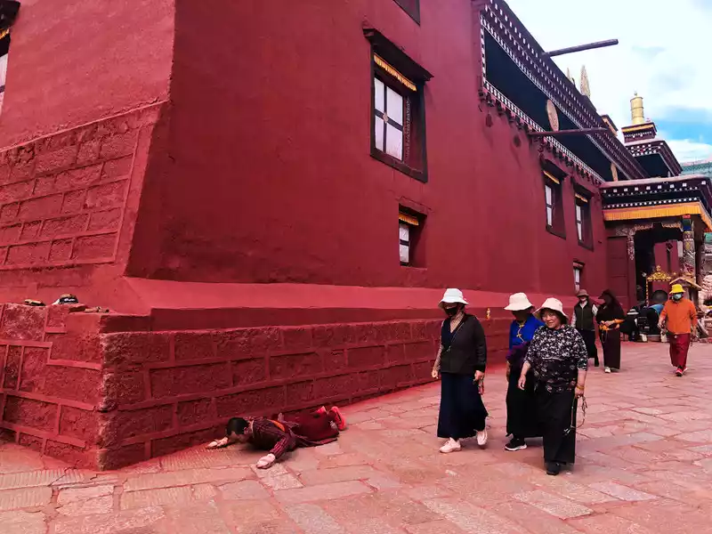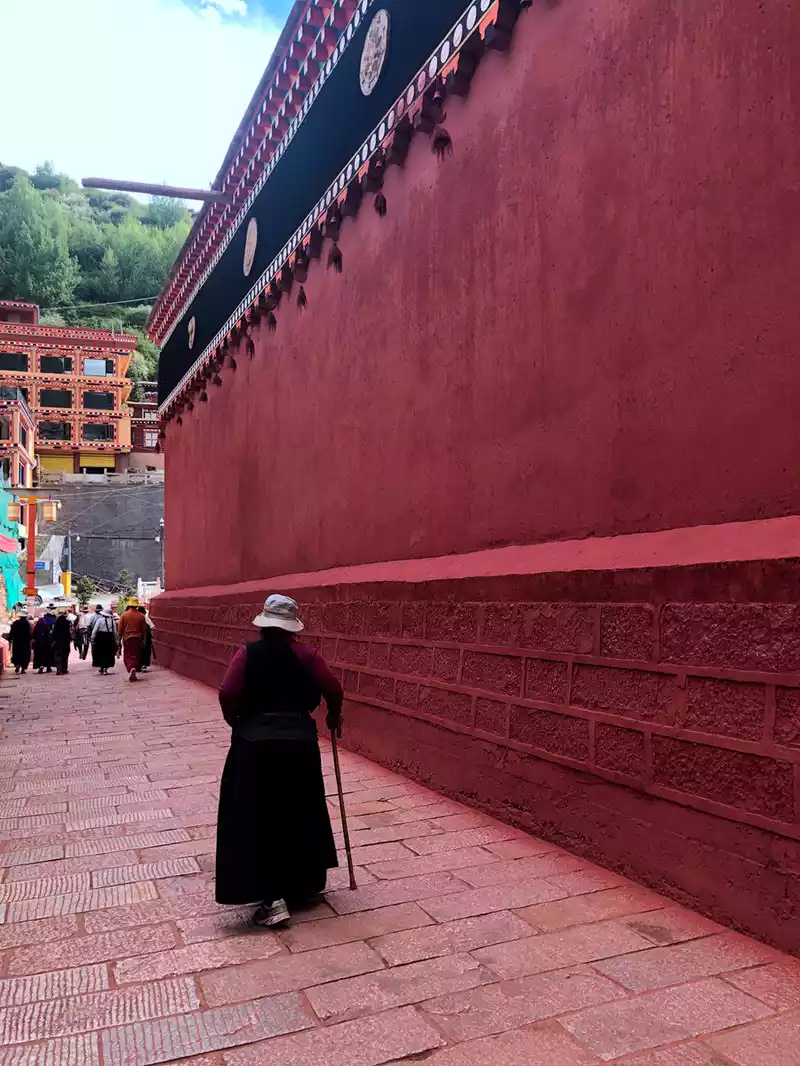 Today's focus, and the focus of this journey, is the Dege Printing Institute. After breakfast, we came here again, and the crowd passing outside the cinnabar red wall was almost one after another, a lot of people. Turning scriptures is a major event in the lives of the Tibetan people, from morning to night, no matter whether it is windy or rainy. As long as you enter the Tibetan area, as long as there is a Tibetan landmark building, someone will pass the scriptures there.