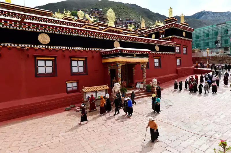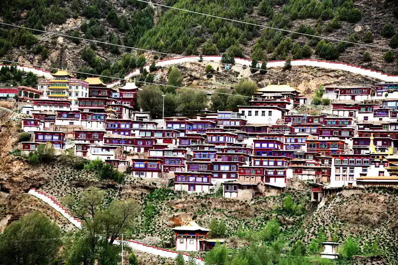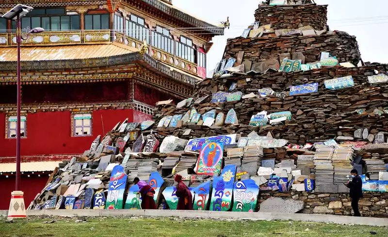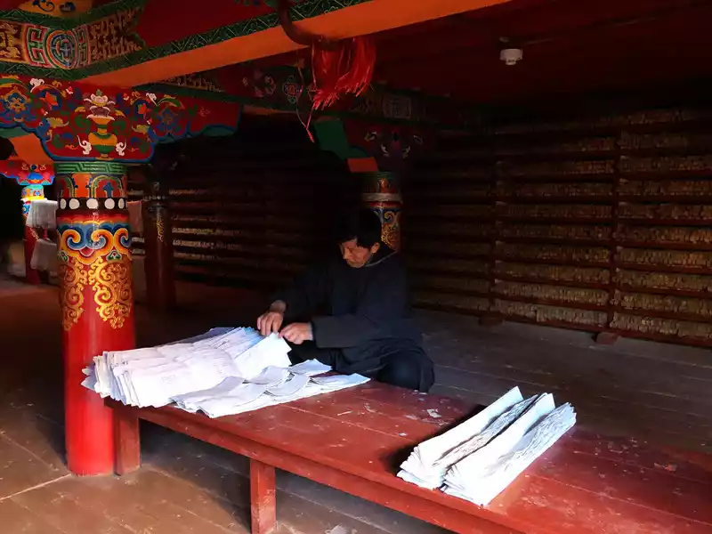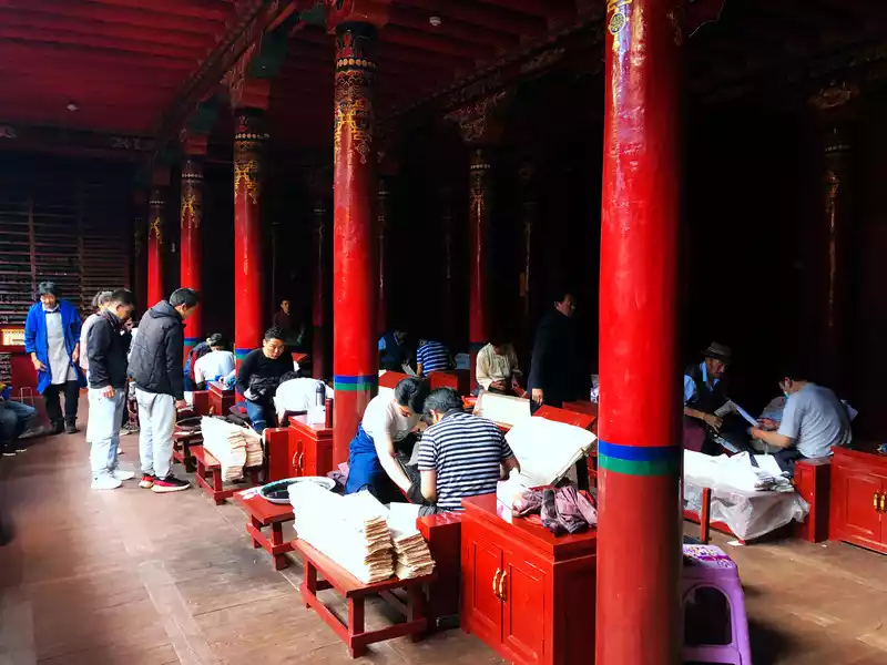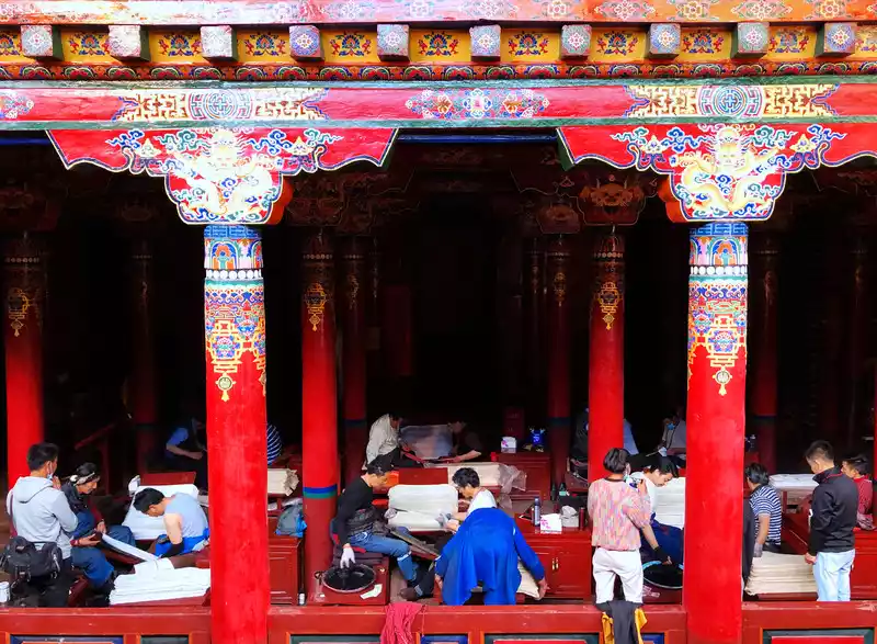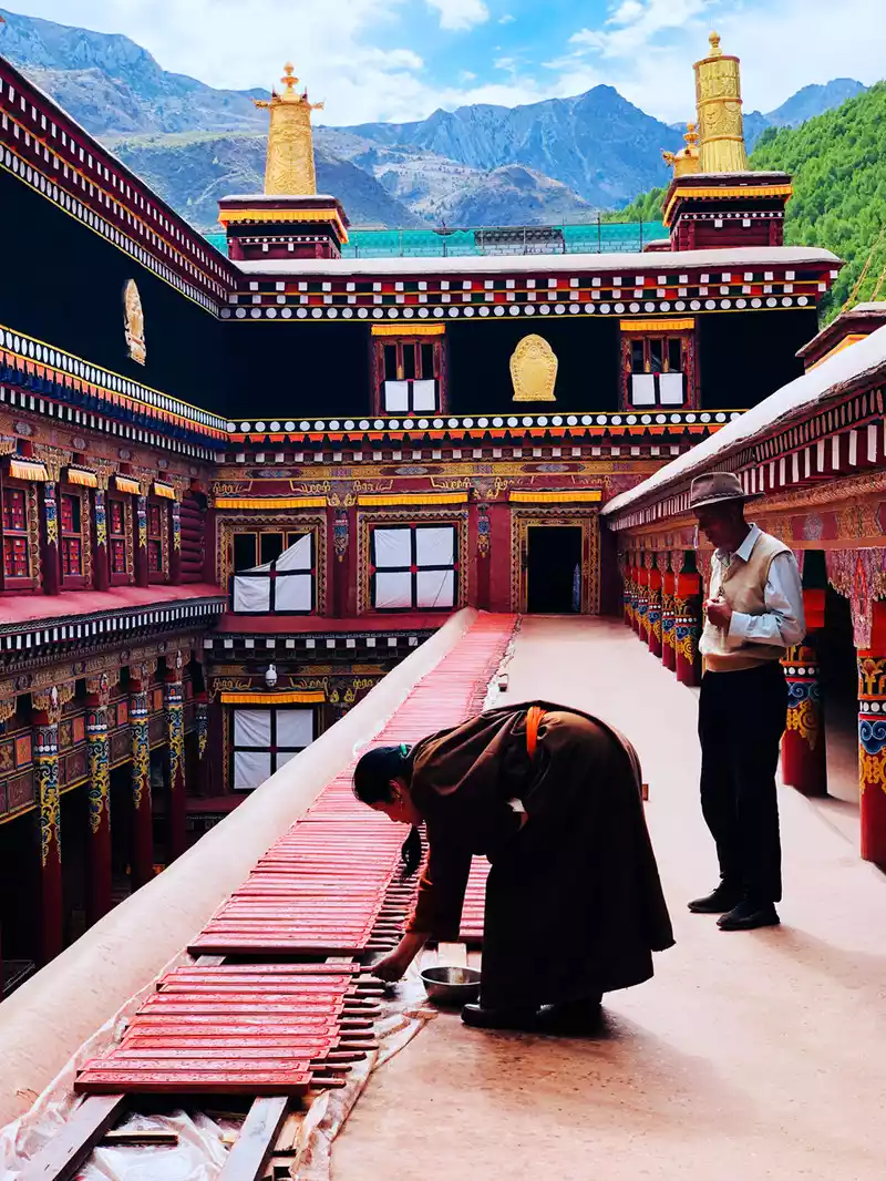 Gaze at the cinnabar red building from a high place in the distance, and the golden roof of the building shines in the sun. The rows of red houses on the hillside behind the Printing Institute seem to take people to Seda. Perhaps, this is the characteristic of the Tibetan settlement area. The crowd of people transferring scriptures is endless, adding a touch of movement to this mysterious printing house.