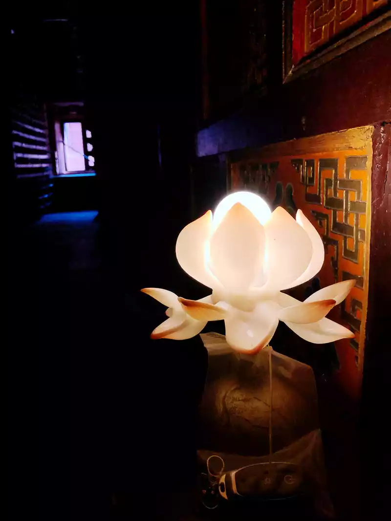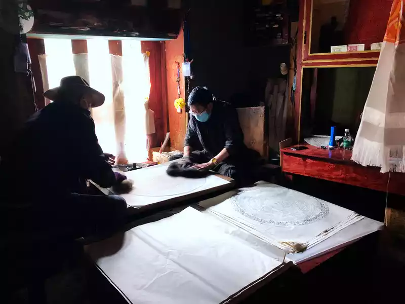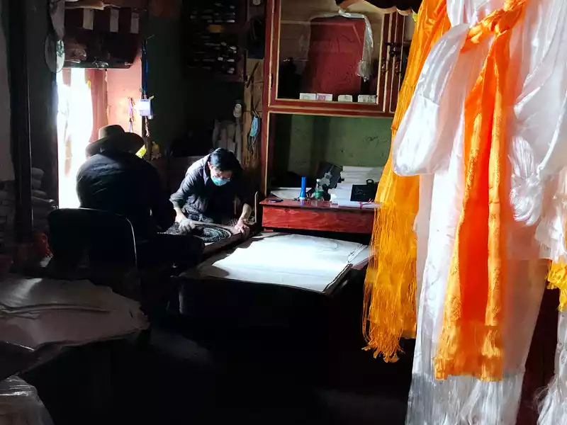 The small house opposite the scripture printing corridor is a place to store scripture paintings. The two craftsmen sat in front of the window, printing one by one in natural light. I looked at it for a while and wanted to leave, but a craftsman suddenly said: Why are you leaving? I don't look at it for a while. Stay and chat with them again. He told me to print more than a thousand paintings a day, which were used on the White Pagoda. For a year, except for the winter in November and December, I work here every day. He has been here for 20 years.