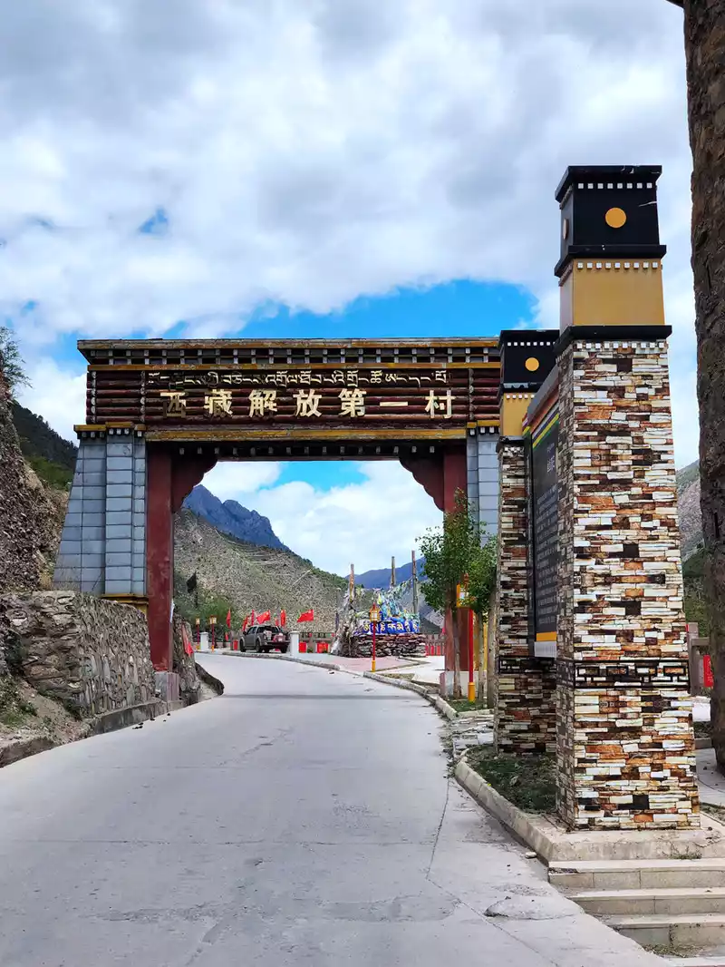 Near the village, the first thing that catches your eye is the gate with the plaque of "The First Village for the Liberation of Tibet", the left side of the gate is carved with three brown and red flags, on which is the picture of the 18th Army entering Tibet and the Tibetan people celebrating, and the watchtower standing next to the gate seems to be guarding this beautiful village that raised the first five-star red flag in Tibet. All of this tells me that this is a place with history and stories.