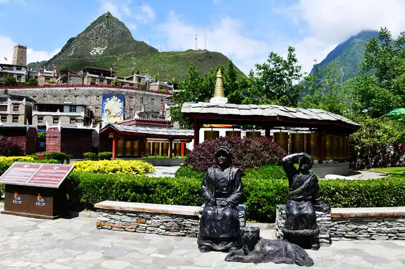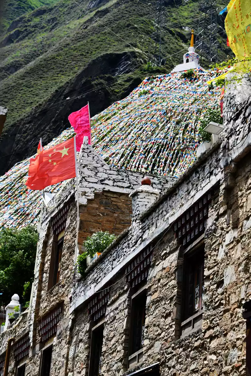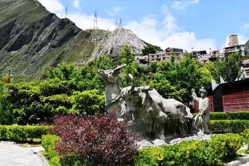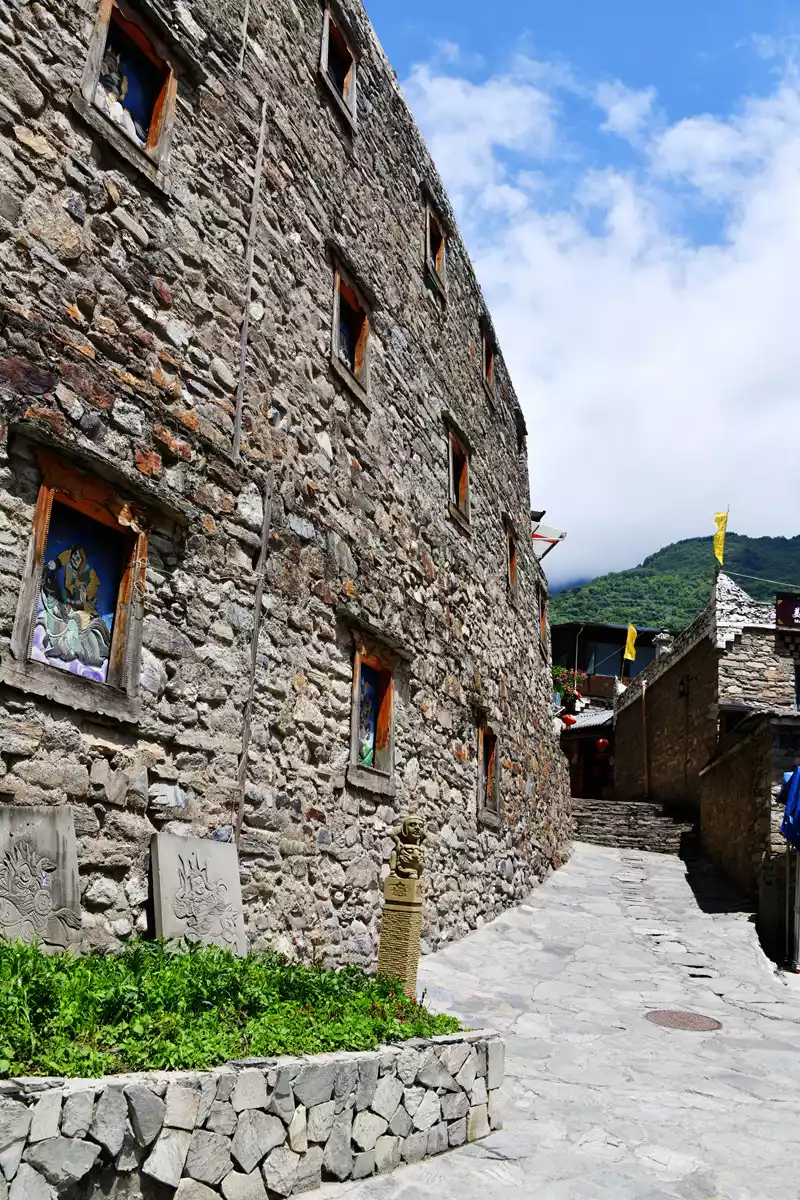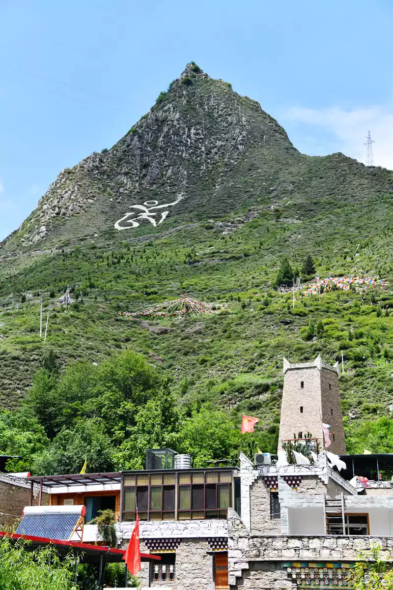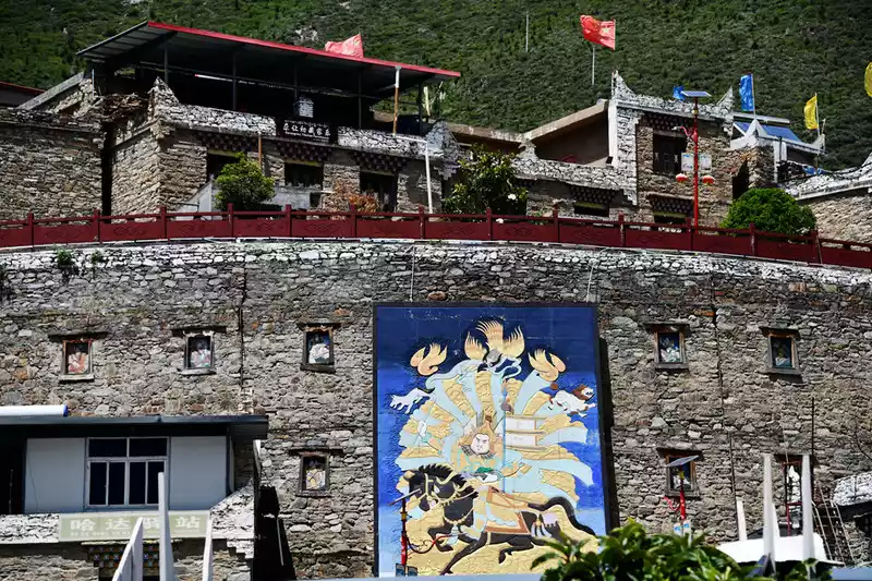 Climbing up the stone steps, I saw a statue of a Jiarong Tibetan couple and a puppy, waiting in front of the prayer wheel. First, gently turn the semicircular prayer wheel to pray for our journey; A sculpture of "two cows lifting the bar" describes the characteristics of local plowing with yaks. On the stone wall in front of the head, a huge gold leaf portrait praising King Gesar shines in the sun; Looking at the prayer flags flying on the top of the mountain, a watchtower protrudes above the mountain houses.