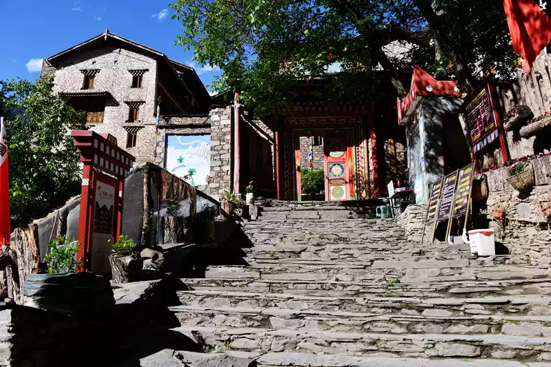 When I came to the gate of the village, I was immediately attracted by the unique architectural style of the ancient village. The mountain gate made of mountain rocks is a scene in itself, solemn and magnificent, facing the green mountains. Through the mountain gate, the layers of typical Tibetan dwellings are connected and connected to each other, like a huge stone castle. It is known as "the first village in the Jiarong Tibetan area". "Ganbao" means "village on the hillside" in Tibetan, and local residents use local materials to build this thousand-year-old village with stones.