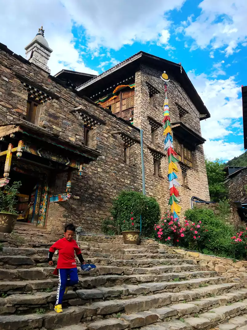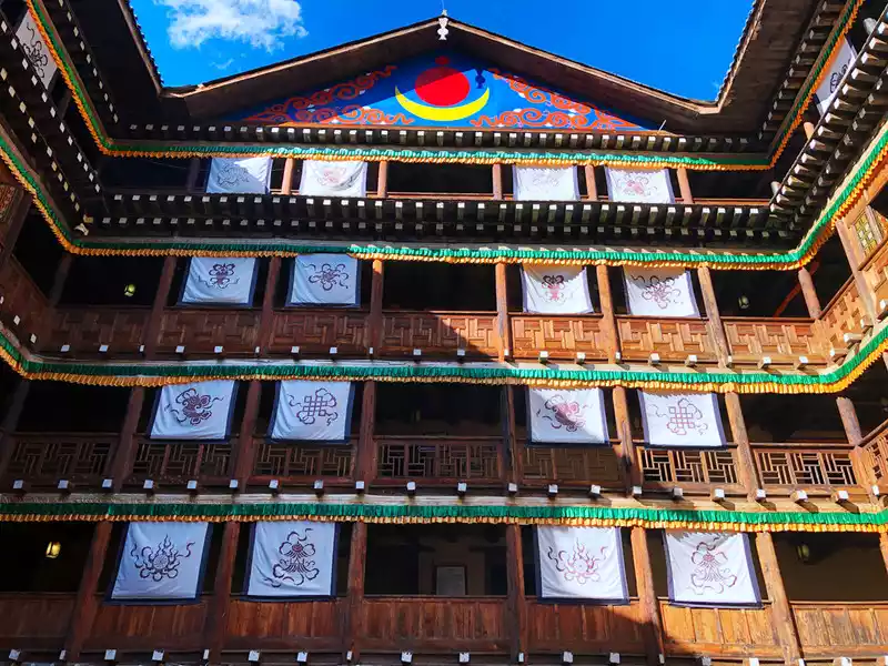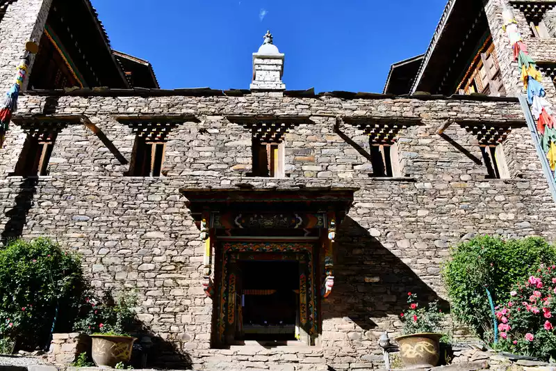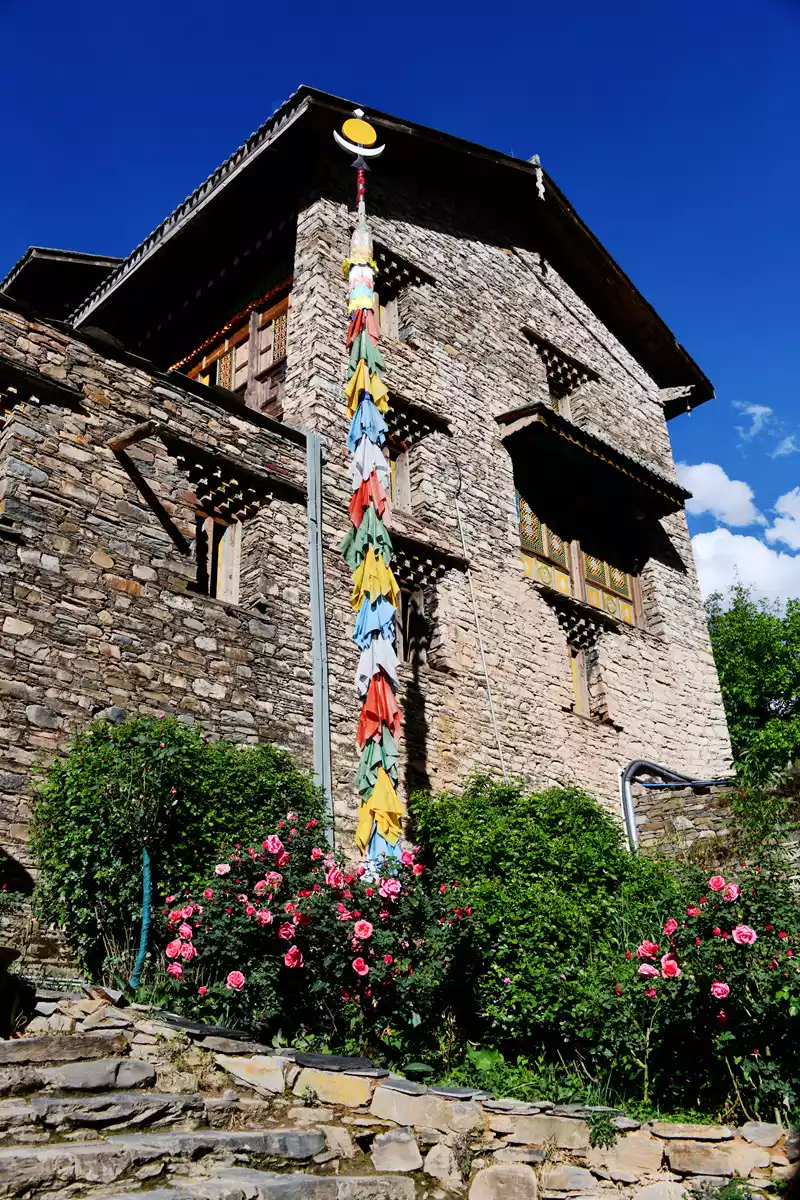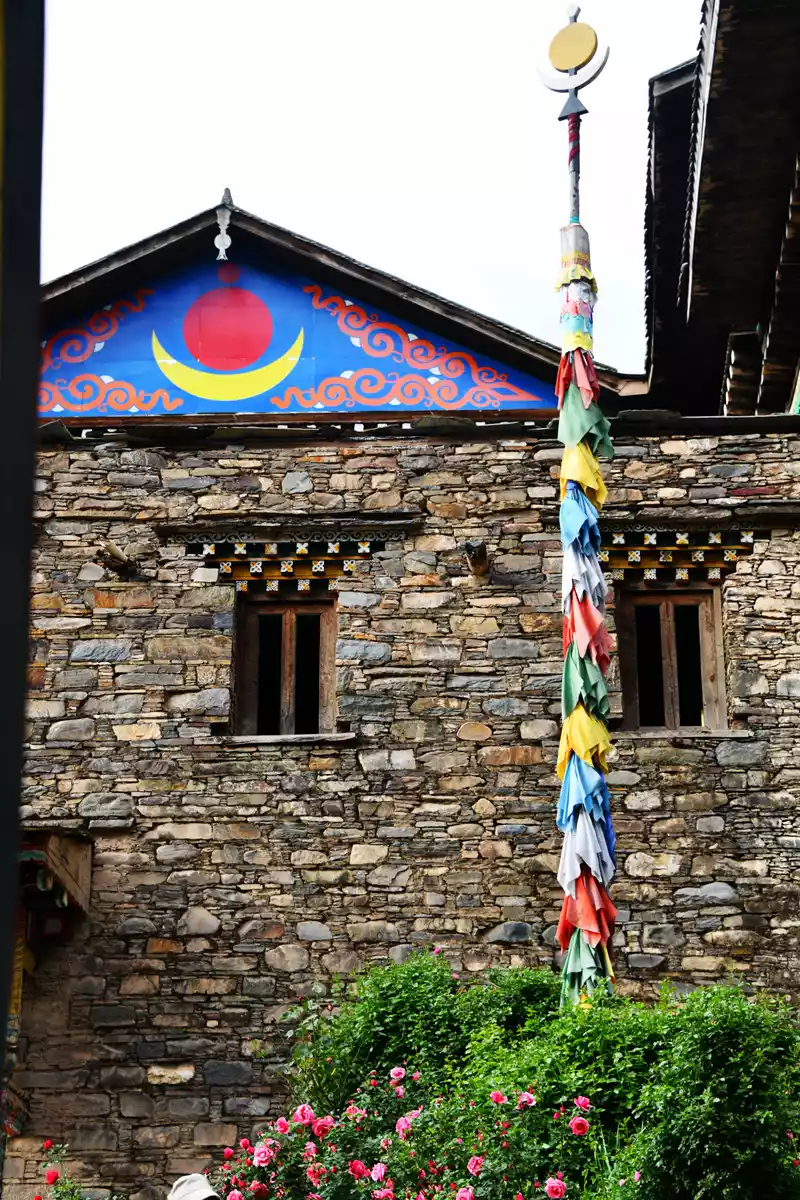A tall Tibetan flagpole in front of the door, topped with a sun and moon air support, and a long mana prayer flag on the flagpole flutters majestically in the wind to resist the invasion of all evil energy.