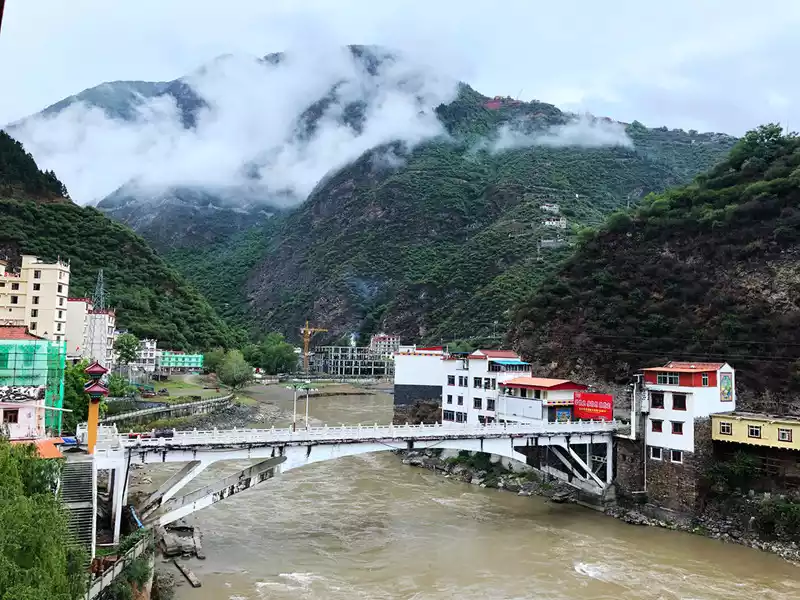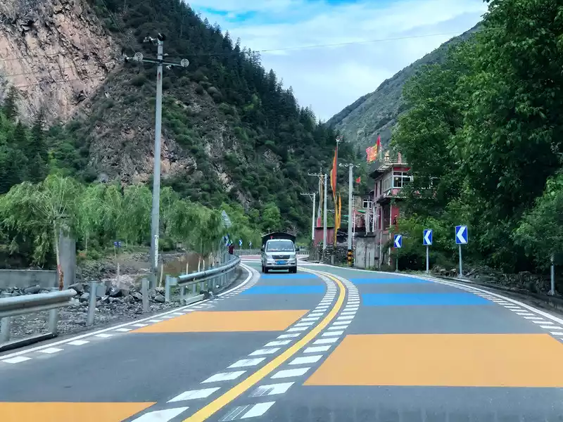 Set off again. Walking along the green mountains and green waters of 317 along the Chengna line is really a great pleasure, last night's rain made the green mountains on both sides more lush, and the Zhuosjia River was running and jumping happily on the side. White clouds appear from time to time in the mountains in the distance, and Tibetan-style houses on the side of the mountain continue to flash. Occasionally, you can see the road painted in different colors, that is, Rainbow Road.