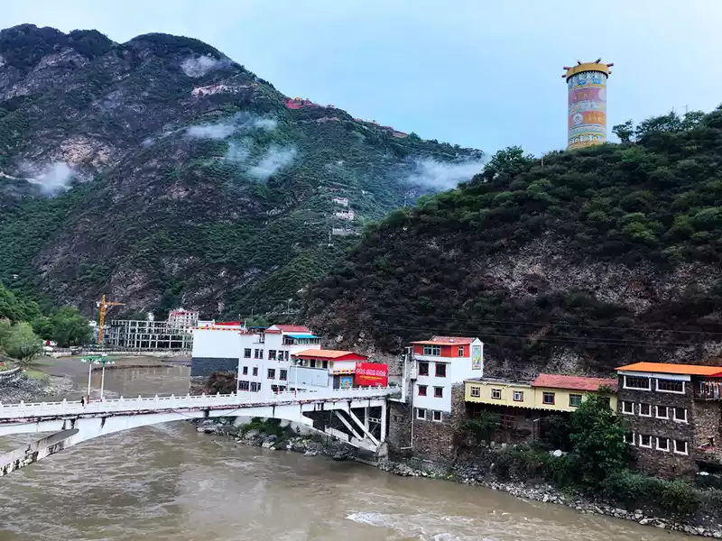 In the morning, when I opened the window, a big river was wide and the mountain was shrouded in clouds and mist, and the most famous Guanyin Temple in the local area was on the top of the mountain. There is a large prayer wheel on the mountain opposite the river, and the bank is a Tibetan house.