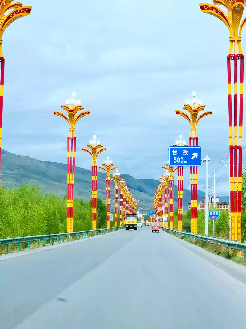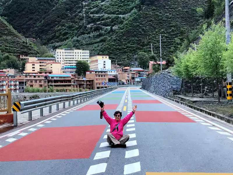 We stopped in front of the beautiful No. 1 Bridge in Shangzhai Town, which is a Tibetan-style bridge, from the bridge body to the piers are full of Tibetan atmosphere, which is very beautiful. I love it so much. I happened to meet two Tibetans walking across the bridge, giving me a chance to take a snapshot. Outside the bridge is the colorful rainbow road, sitting in the middle of the road and recording this beautiful moment.