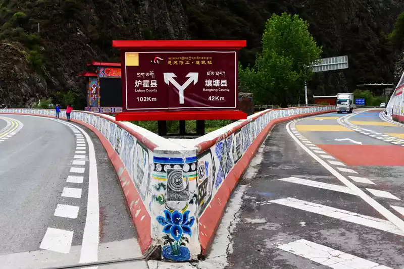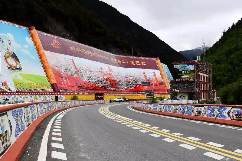 fork in the road between Rangtang County and Luhuo County is a scene, the huge Rangtang County propaganda wall on the whole wall of the mountain, particularly eye-catching, colorful roads and colorful high-speed guardrails, It all attracts you to stop.