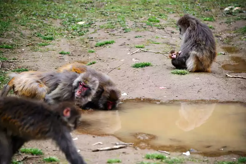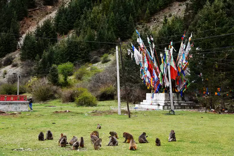 Not far ahead, we saw a pile of prayer flags and a white pagoda, which is not uncommon in Tibetan areas, but a group of Tibetan macaques attracted us and stopped immediately. It turned out that this is a protected viewing area for Tibetan macaques. Dozens of Tibetan macaques jumped and chased there excitedly, and several female monkeys jumped from here to there with their little monkeys, and the little monkeys hugged their mothers tightly and drilled around their mothers. It's funny! Some of the big monkeys ran towards us and shouted at us as if we had encroached on their territory. This group of Tibetan macaques is so interesting.