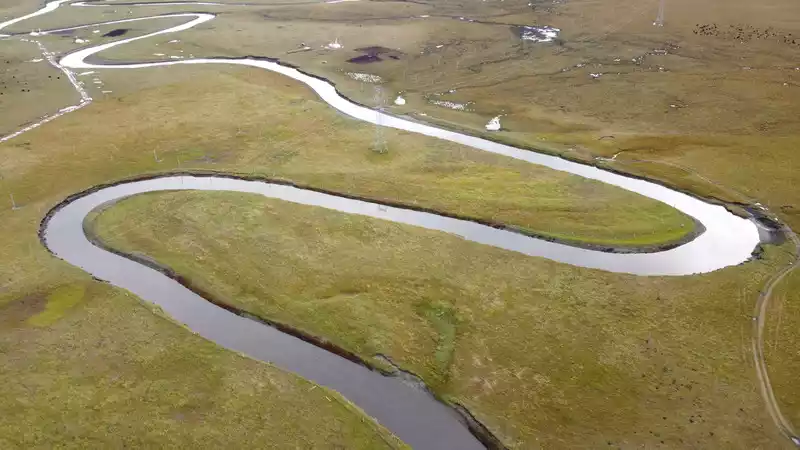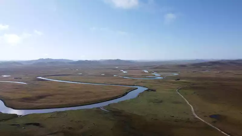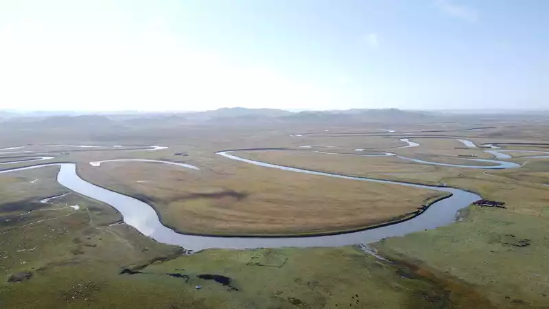 drone was released at sunset and photographed the winding river channel of the grassland.