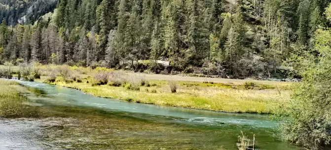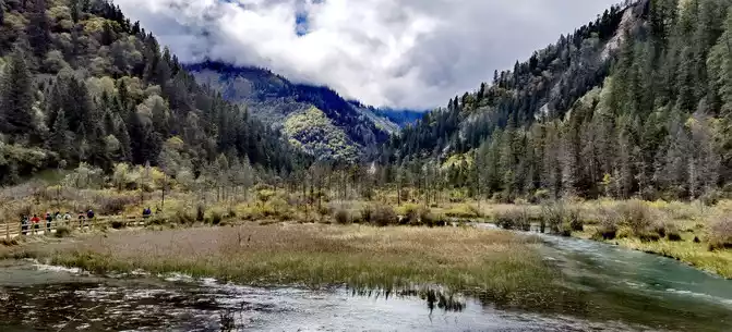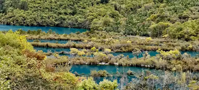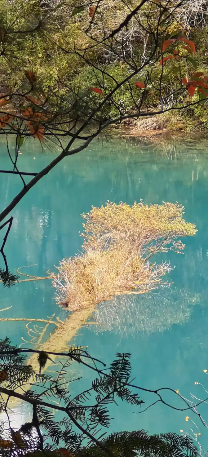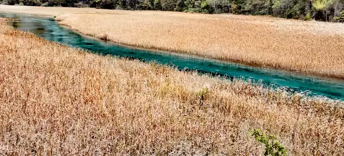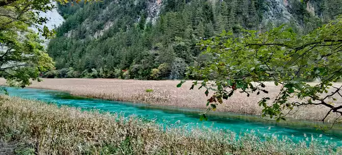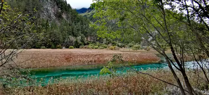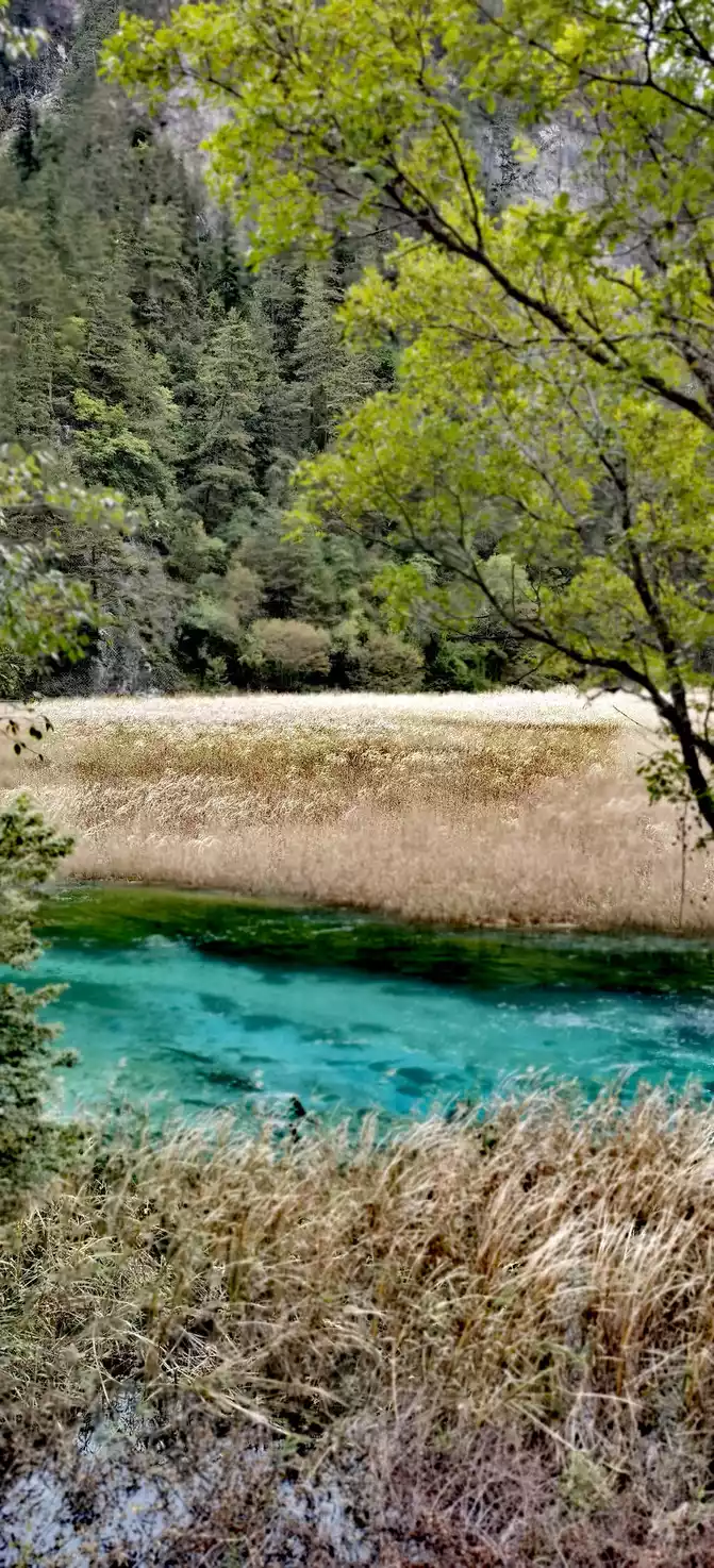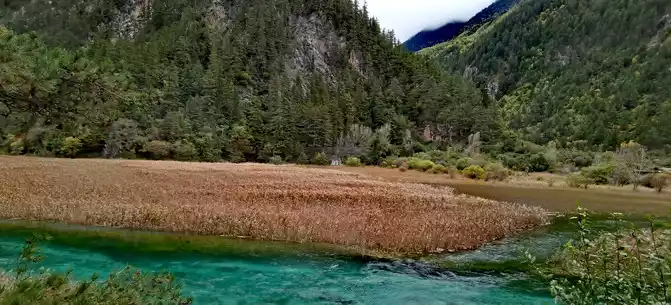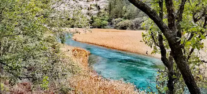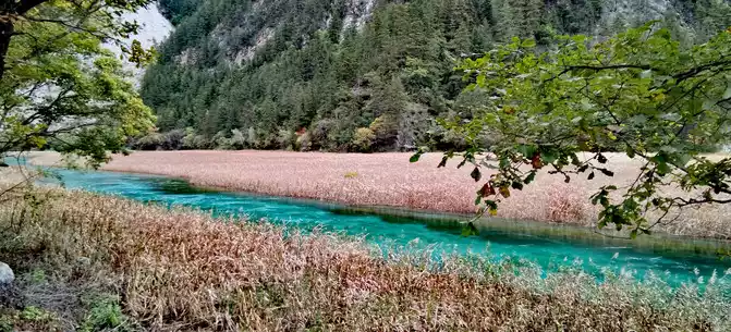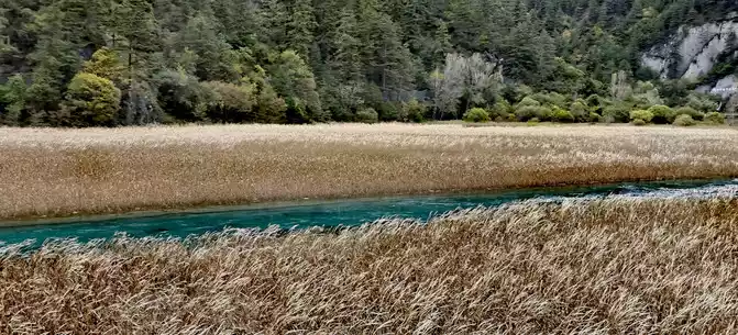 The "Reed Sea" is a semi-swampy lake with an altitude of 2,140 meters and a total length of 2.2 kilometers. There is a flowing water belt in the middle of the sea of reeds, winding through the sea of reeds, dividing the sea of reeds into two halves. This water has a beautiful jade-like luster and color, so it is called the Yudai River. Legend has it that this beautiful jade belt river was transformed by the belt of the goddess of Jiuzhaigou Mountain, Wonuo Seyan.