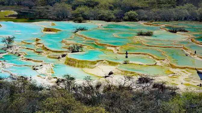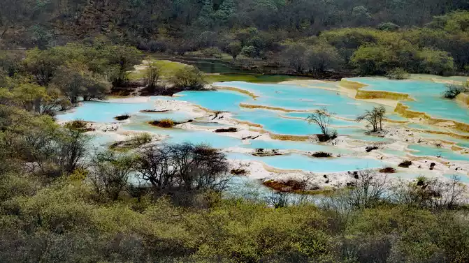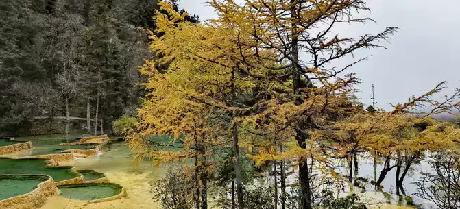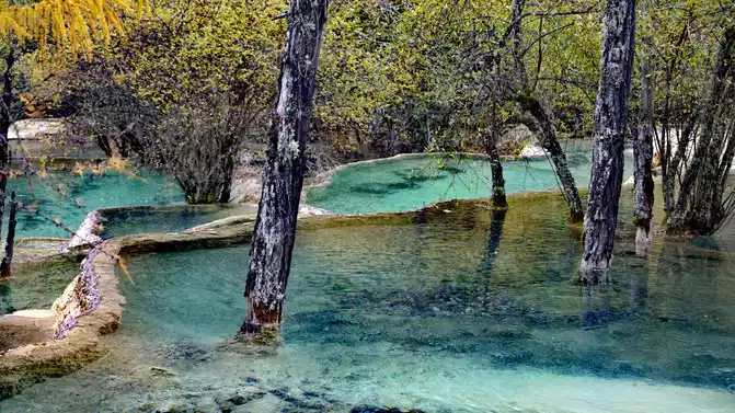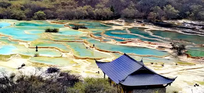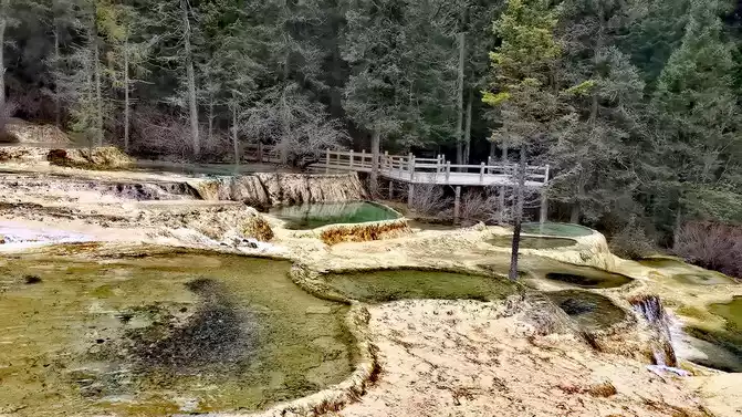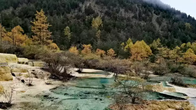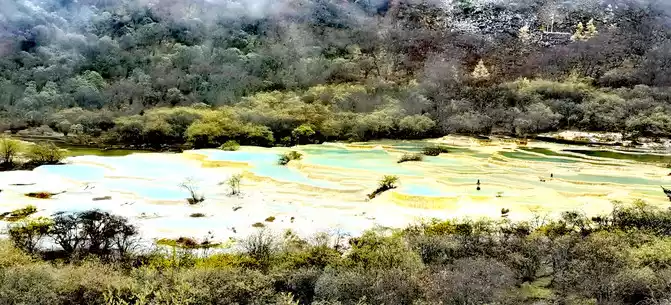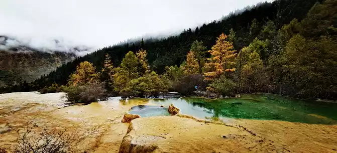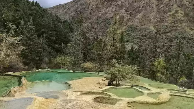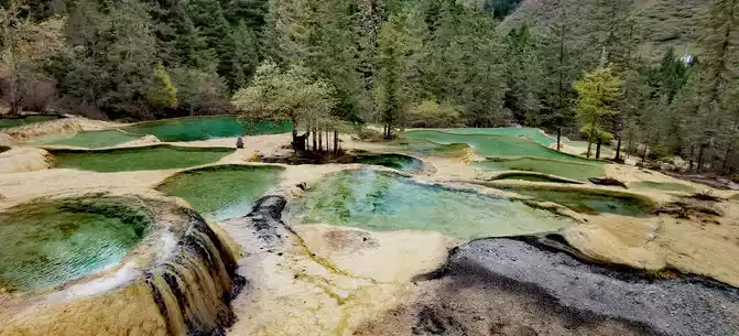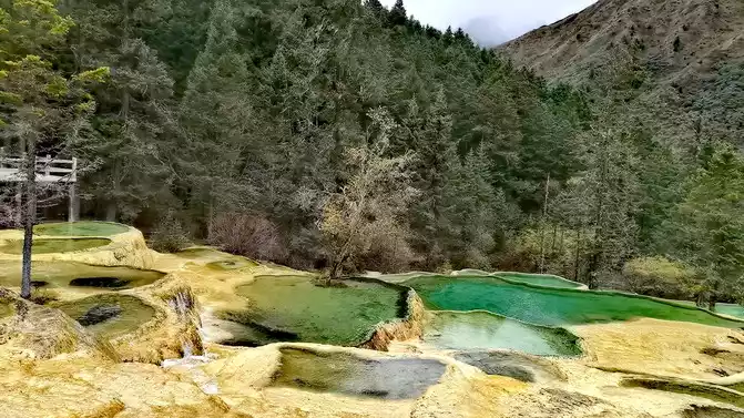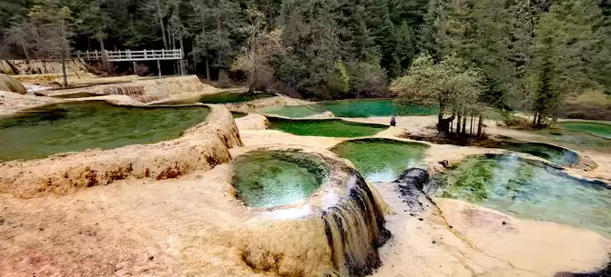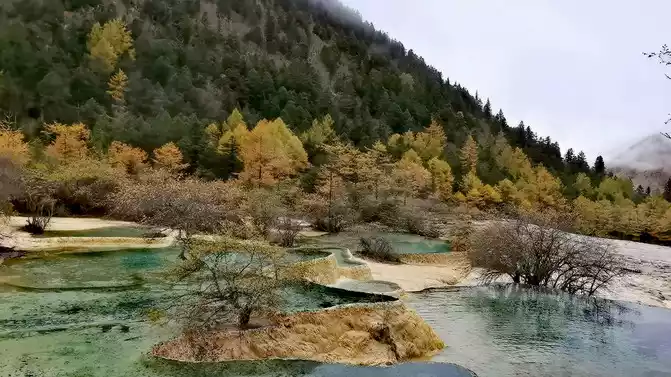 Walk 2 kilometers down the colorful pond to the beautiful pond. The Huanglong Zhengyan Pool covers an area of 20,000 square meters, consisting of 658 color pools, and is the second largest color pool group in Huanglong, with an altitude of 3,454 meters, which is the richest and most beautiful color pool group in the color pool group of Huanglong Scenic Area.