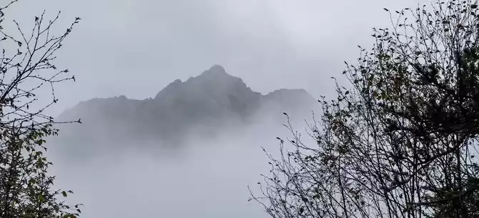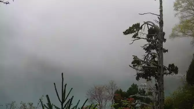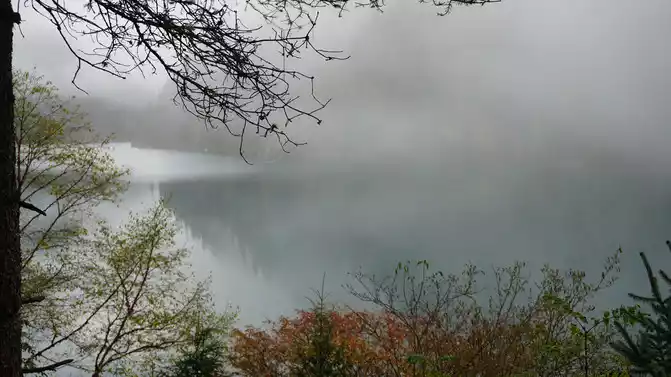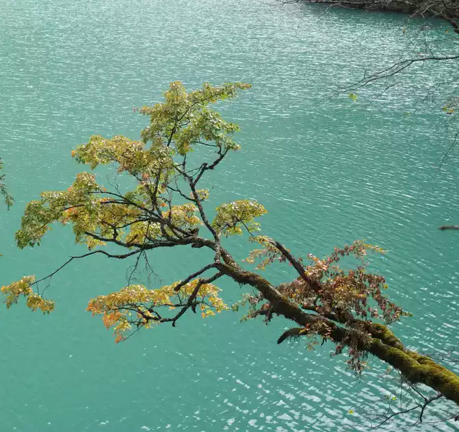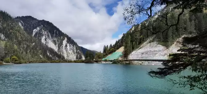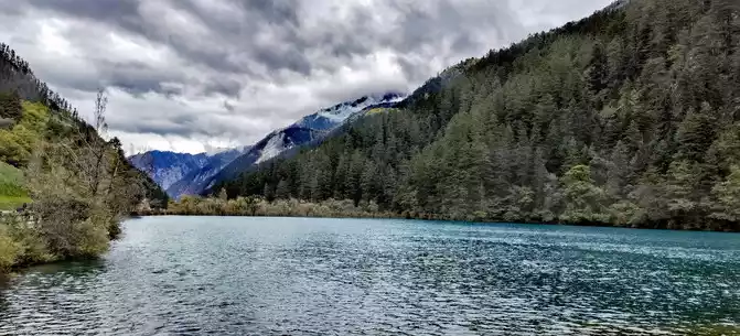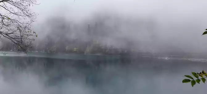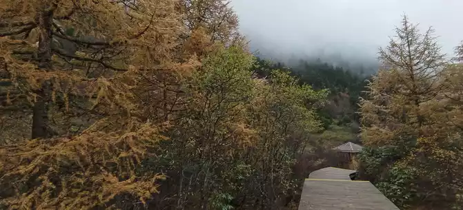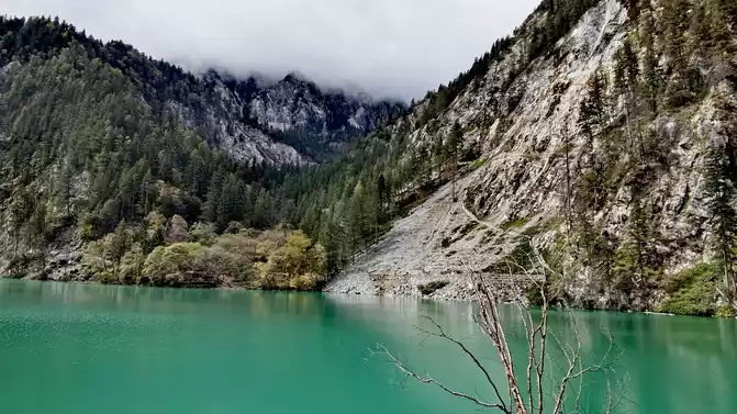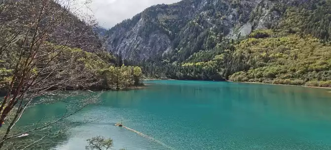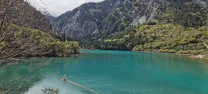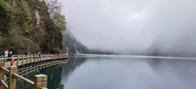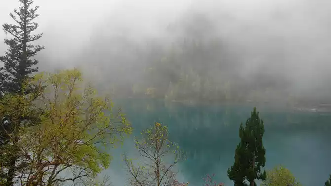 We took the scenic transportation bus to Changhai first. Changhai is the highest altitude and widest lake in Jiuzhaigou, the water surface of the lake is dark blue, and the water source comes from the melting snow in the mountains. Strangely, there is no water outlet around the Changhai, but the water does not overflow the embankment in the summer and autumn rainy seasons, and the long drought in winter and spring does not dry up, so the locals of Jiuzhaigou call it a treasure gourd that is dissatisfied and leaks dry. The branches and leaves of this ancient tree only grow to one side, and the other side is bare. When we arrived, it was foggy and we couldn't see in the distance. Take a few photos and take the scenic transportation car to the next attraction, Colorful Pond.