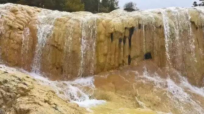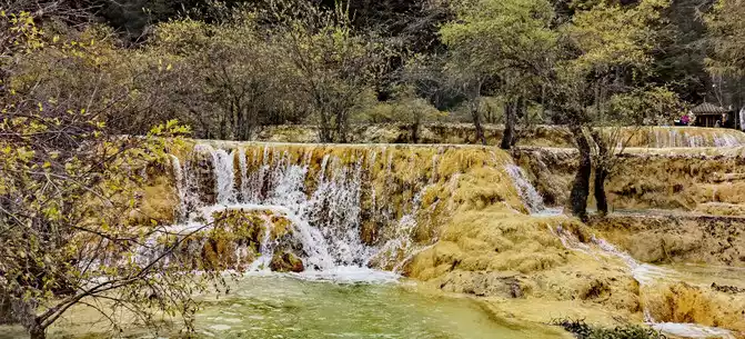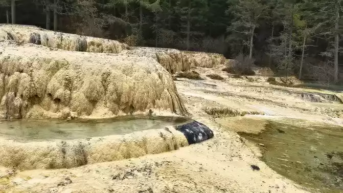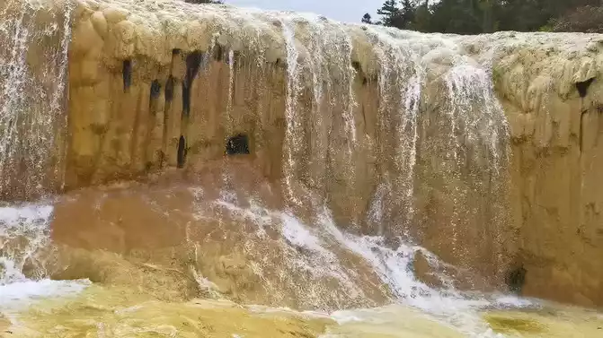From the Spiegel Reflection Pool to the Washing Cave, there is a travertine stream about 1,500 meters long and 70-120 meters wide, called "Golden Sand Paving". On the right is the bonsai pond. It consists of a group of nearly a hundred pools, with pools within pools and ponds coats. The bottom of the pool is yellow, white, brown and gray, and the surface of the pool is clear and dust-free, like a mirror; In the pond next to the pool, there are wood, stone, flowers and plants everywhere, just like a strange bonsai made in heaven and earth, which is really beautiful.