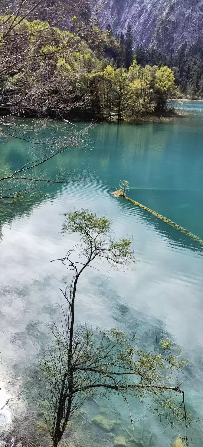 At this point, the attractions of Chawagou have been played. We took the bus to the Nuorilang transfer station, and we sat down on the steps of the stairs and began to eliminate the dry food in the bag and convert the weight in the bag into energy on our bodies! I found that many tourists brought self-heating food, which looked very tempting when it was hot. After eating some dry food, I took a car to the Zhizegou and went to the sea of arrow bamboo. Arrow bamboo is the favorite food of giant pandas, and it grows widely around the shore of the lake, which is the biggest feature of the arrow bamboo sea, hence the name. The lake is open and long, and the water is blue. The reflection is vivid, making it impossible to tell whether the mountain is in the water or the water is submerged in the mountain. In the sea of arrow bamboo, there are many calcified dead wood, forming peculiar coral trees, and some new trees can be seen on the rotten wood, which is called rotten wood renewal, or dead wood spring and regeneration trees.
