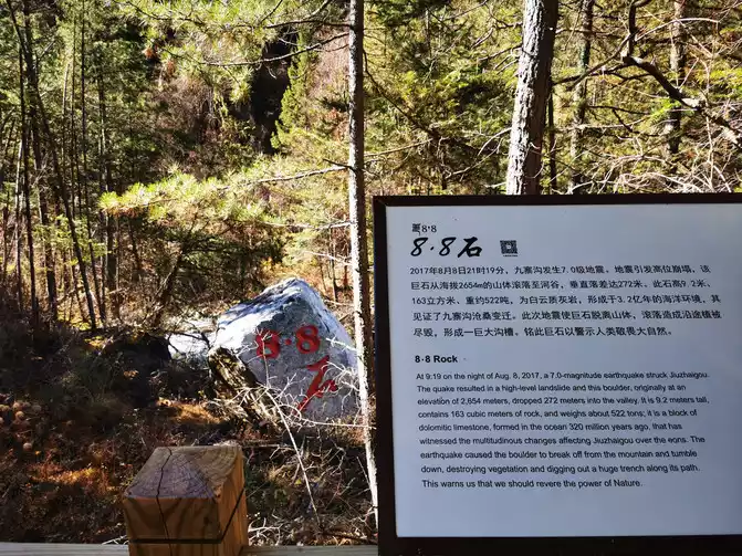 8.8 Seismic Stone - This 522-ton stone fell from the mountain at an altitude of 2,654 meters in the 17-year-old Jiuzhaigou earthquake and rolled all the way down to the river valley , destroying all vegetation along the way.