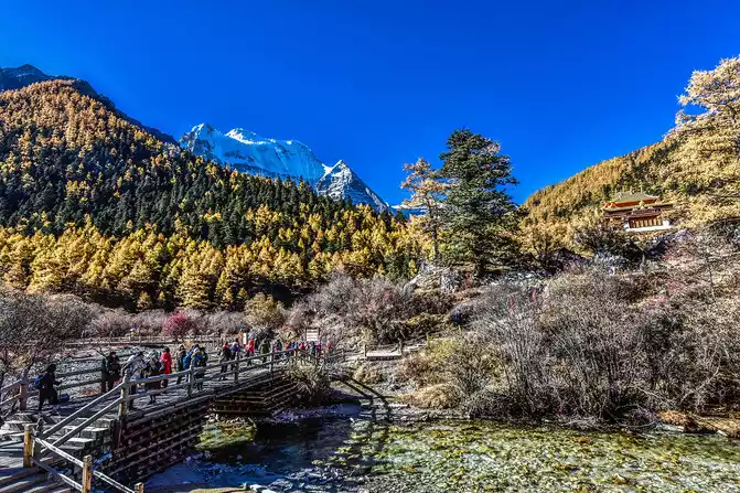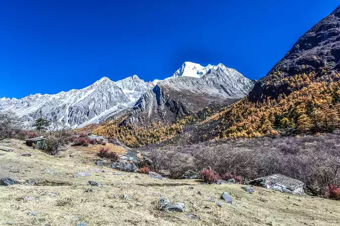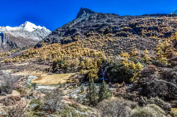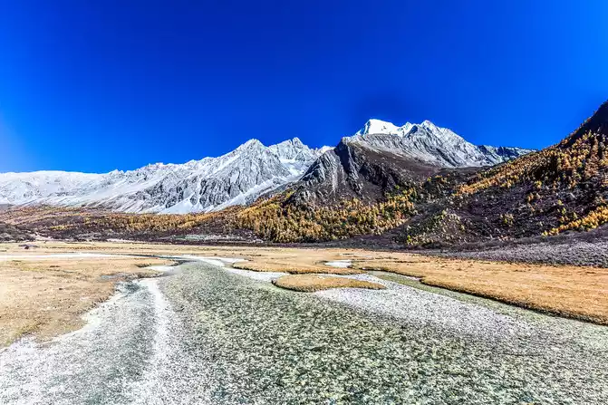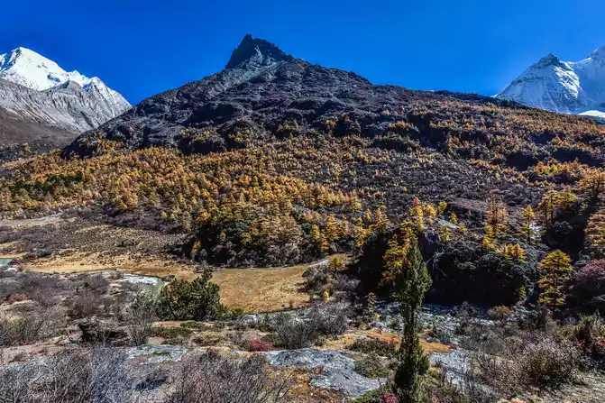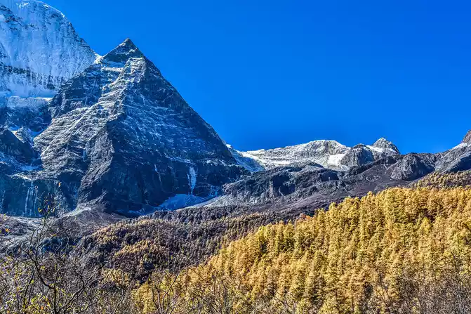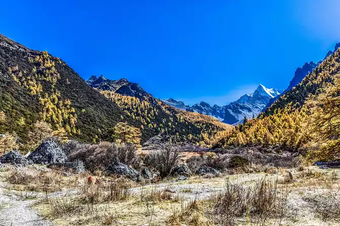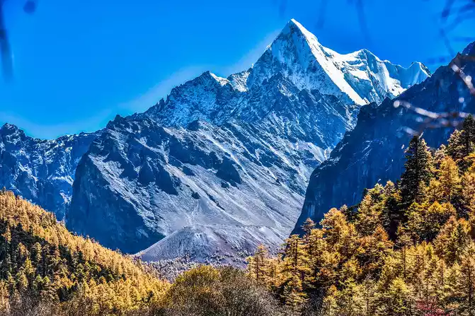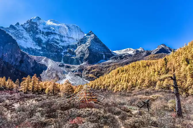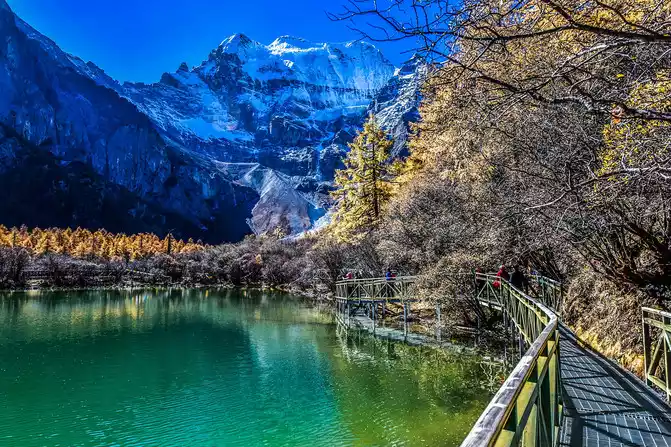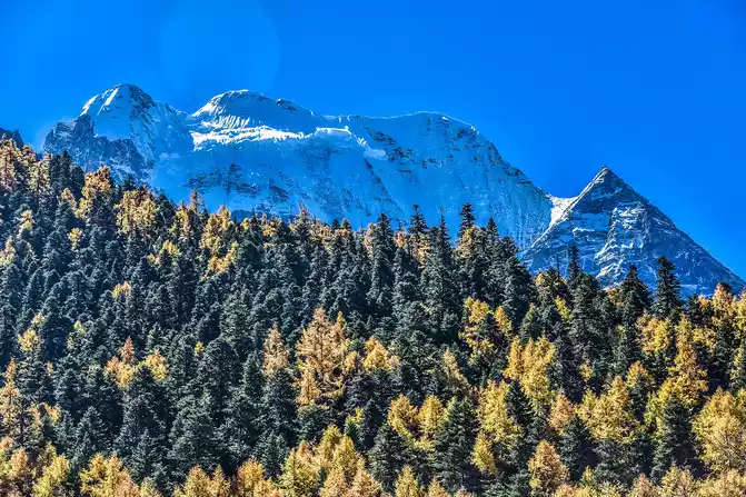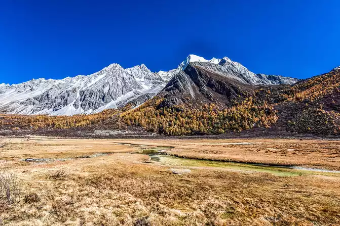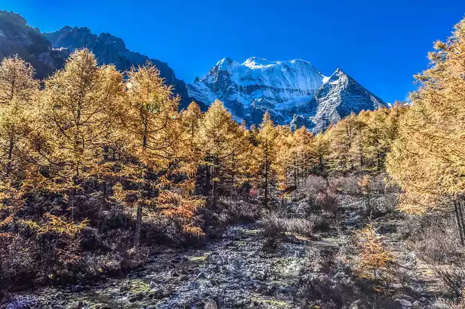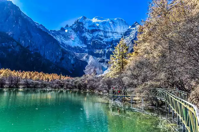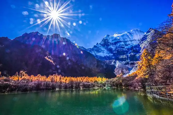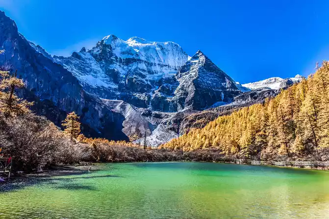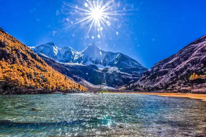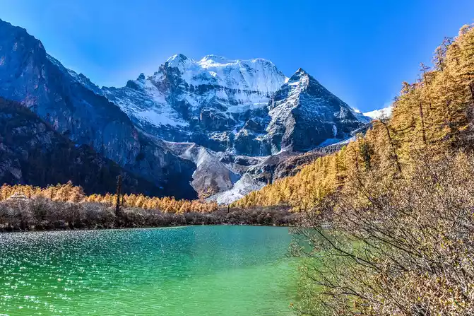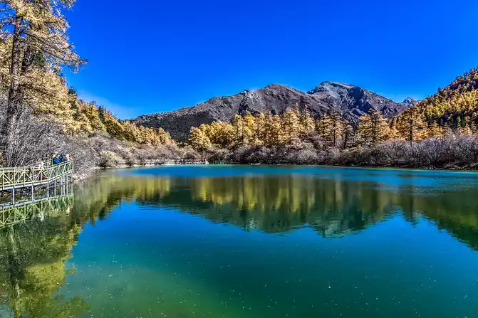 Zhuomula Lake is a relatively closed lake, surrounded by various snow-capped mountains, forming a unique small environment. Swimming by the lake is intoxicating, and the sapphire-like water contrasts with the deep yellow trees, making it a paradise for photography enthusiasts.