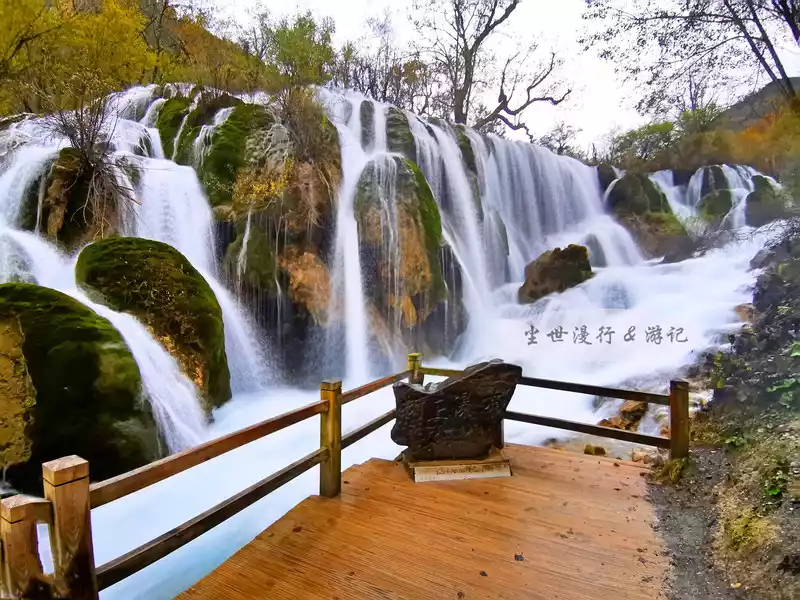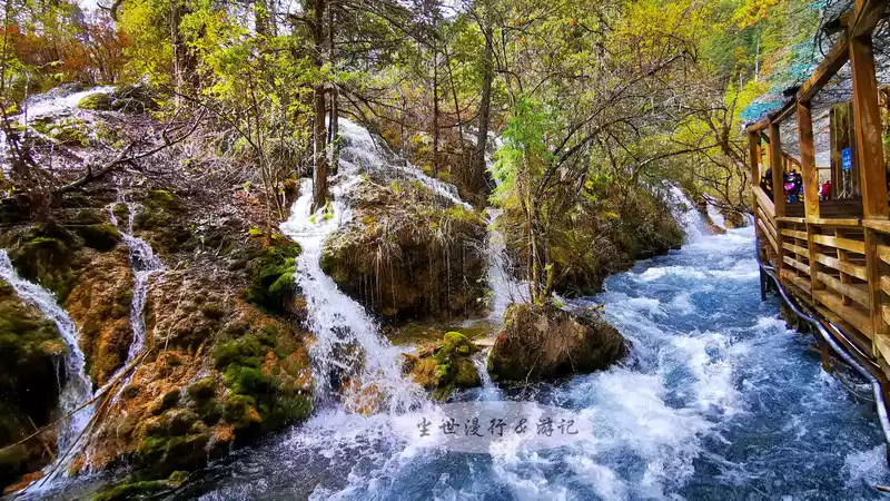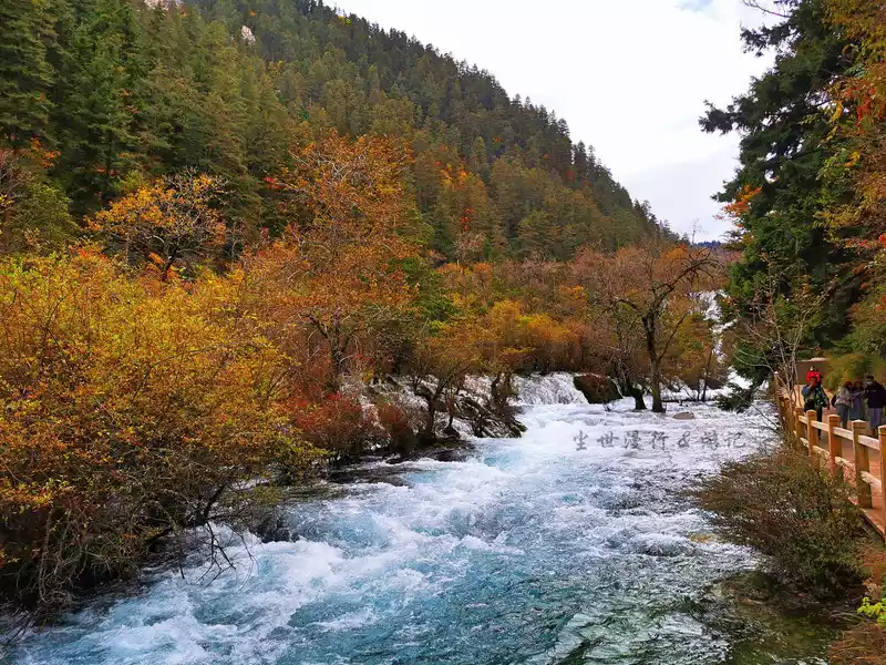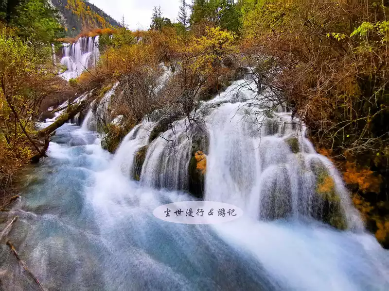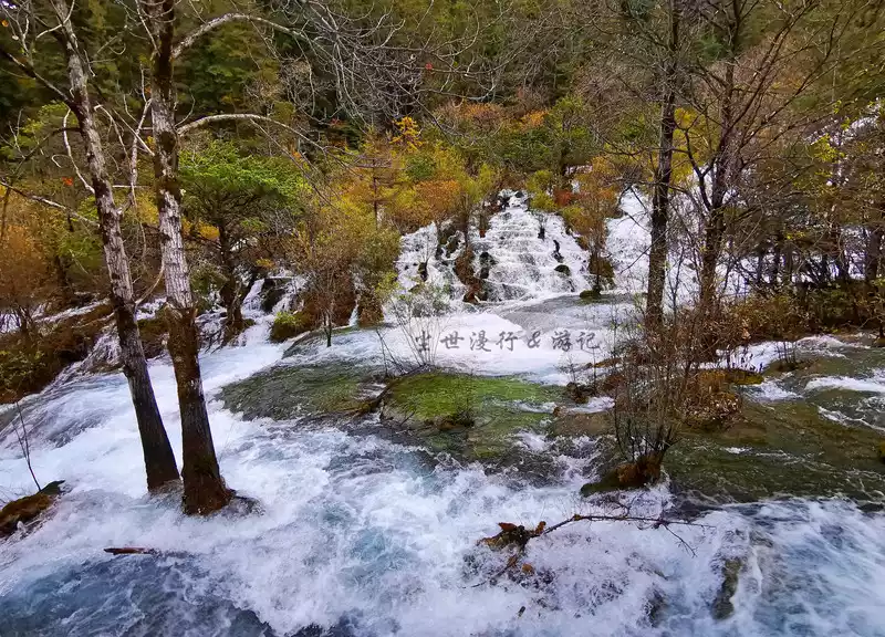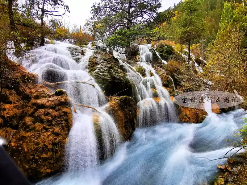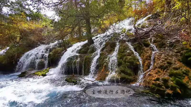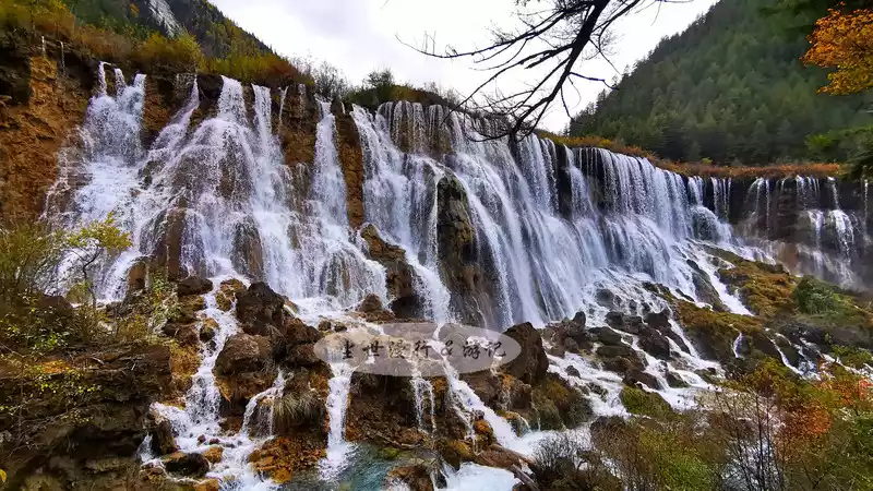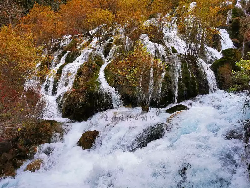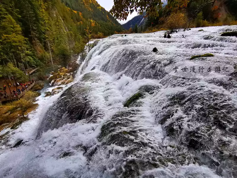 The water rushing from the pearl beach rolls down the edge of the cliff, forming a wide crescent-shaped waterfall. The waterfall fell to the bottom of the valley, emitting a deafening roar and forming a raging torrent. This rapids is the most beautiful, the most rapid, and the loudest sound among all the rapids in Jiuzhaigou.