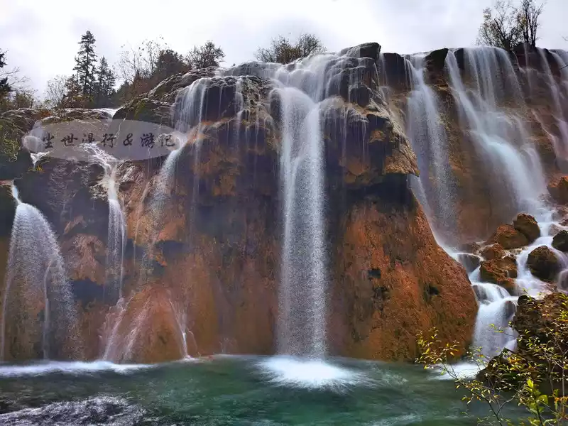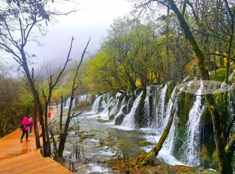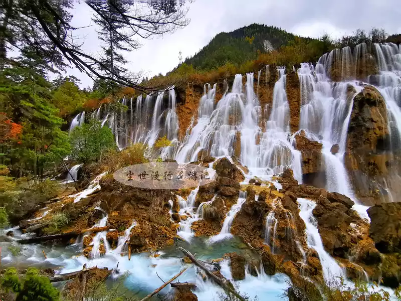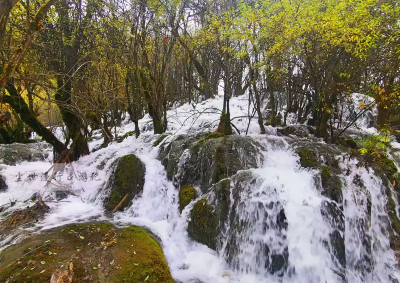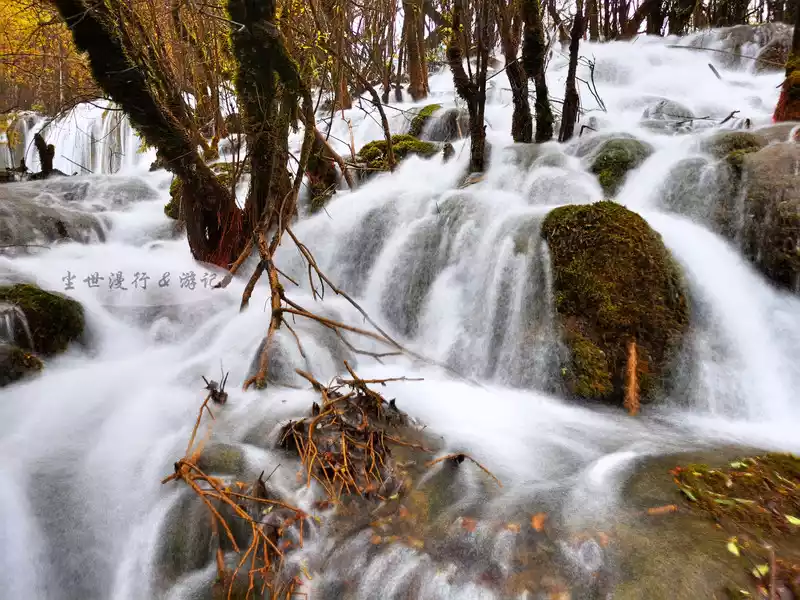 Shuzheng Waterfall is located next to the road in front of Shuzheng Village and is the smallest of the four major waterfalls in Jiuzhaigou. At an altitude of 2,295 meters, a height of 25 meters, and a width of 72 meters, the nameless seawater rushes along the lake embankment, and is divided into thousands of water bundles by the trees in the water and gathers to the top of the waterfall.
