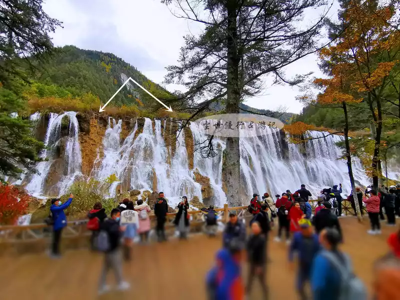 The arrow in the picture below points to the part of the 7.0 magnitude earthquake that occurred in Jiuzhaigou County on August 8, 2017, and the severely damaged section of Nuorilang Waterfall collapsed in this earthquake.