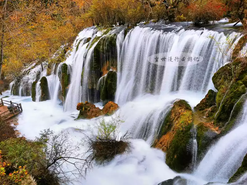 Nuorilang Waterfall is divided into countless streams among red, yellow and green leaves, and the scenery is extremely charming.