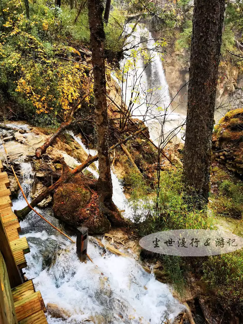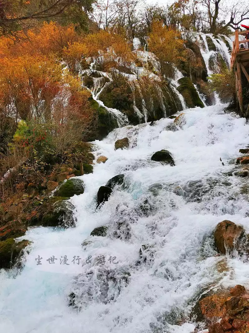 Walking along the observation deck on the north side of the Panda Sea to the end, down a steep staircase step by step, I saw a jet rushing down to the bottom of the valley, and in the middle of the stream was cut into several sections by the rock wall and boulders protruding from under the cliff. (I don't see the observation deck here, it is difficult to take pictures when shooting, which may be related to the 2017 Jiuzhaigou County earthquake)