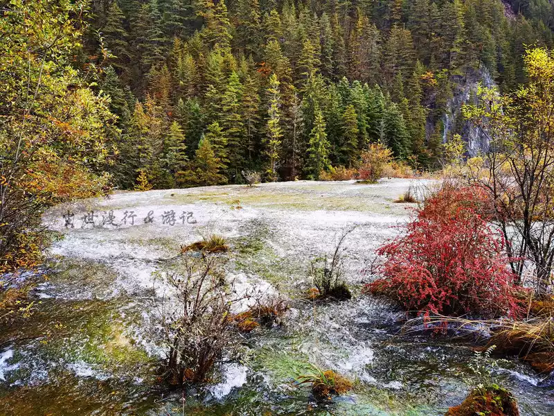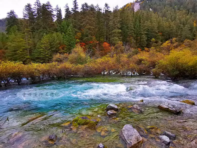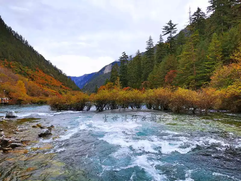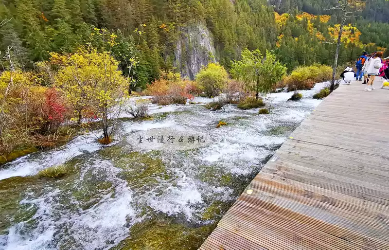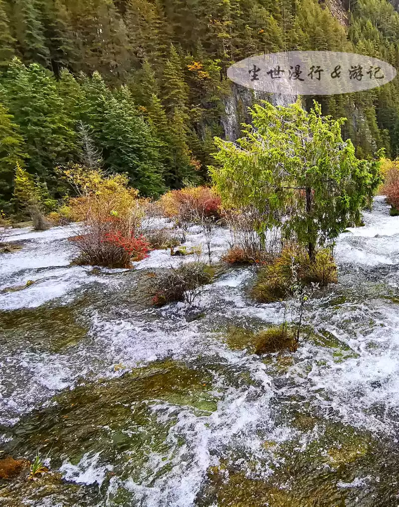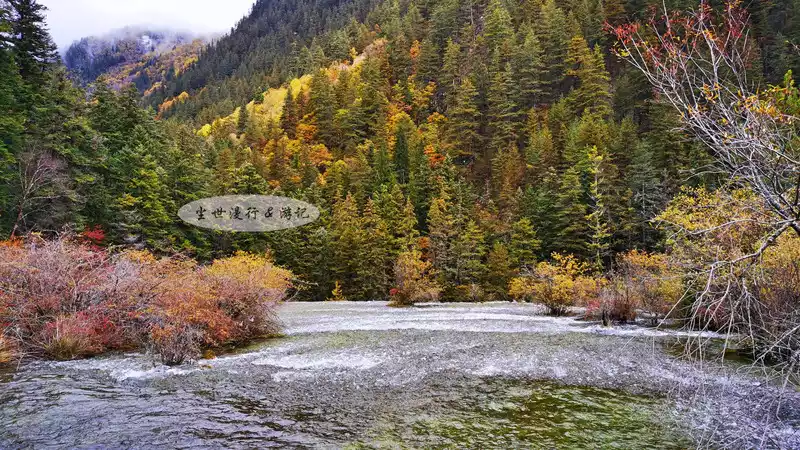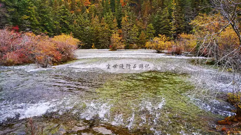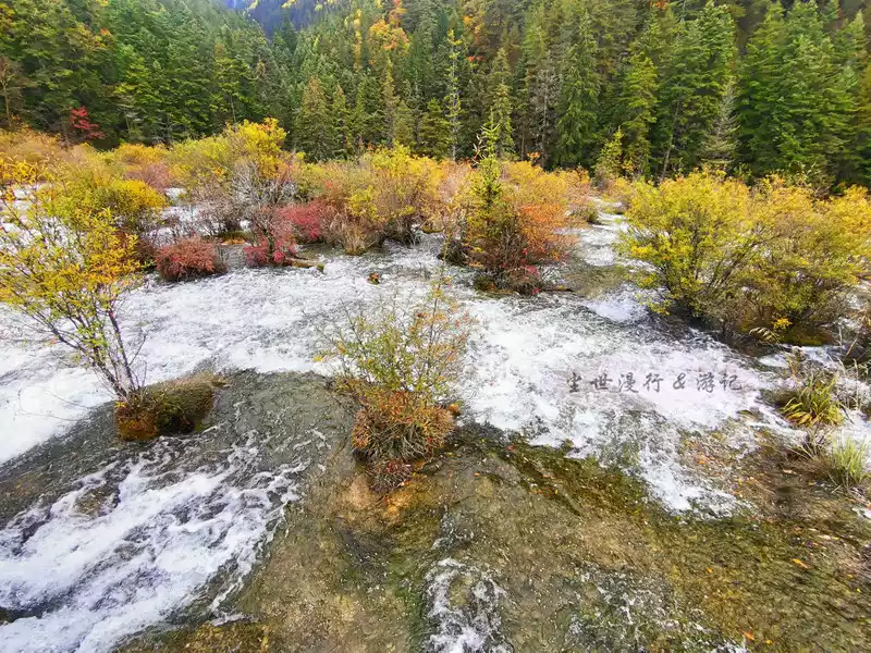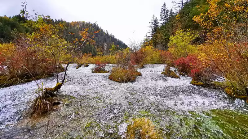 Pearl Beach is a relatively wide stone beach among the many lakes in Jiuzhaigou. There is a trestle bridge across the pearl beach, and the water beach on the south side of the trestle is covered with shrubs. The rapids pass under the trestle and on the shallows on the north side, stirring up countless rolling and jumping pearls.